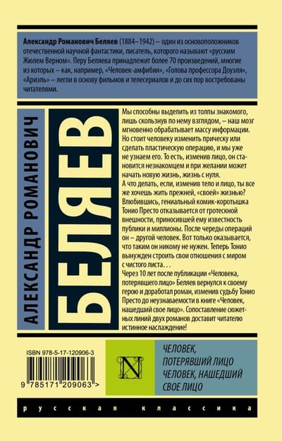 But what to do if, having changed your body and face, you still want to live the same old, "your" life? Having fallen in love, the brilliant comic short Tonyo Presto gives up his grotesque appearance, which brought him public fame and millions. After a series of operations, he is a different person. But it turns out that no one needs him like that. Now Tonio is forced to build his relationship with the world with a clean slate ... 10 years after the publication of "The Man Who Lost His Face" Belyaev returned to his hero and finalized the novel, changing the fate of Tonio Presto beyond recognition in the book "The Man Who Found His Face. The juxtaposition of the storylines of the two novels will give the reader a real treat!