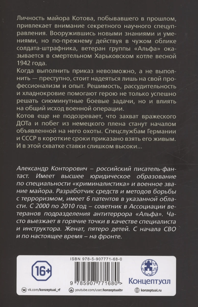 The identity of Major Kotov, a former soldier in the past, attracts the attention of a secret scientific special department studying the phenomenon of time travelers. Armed with new knowledge and skills, but still operating under the false guise of a penal soldier, the Alpha Group veteran finds himself in the deadly Kharkov pocket in the spring of 1942. When carrying out an order is impossible, and failure to carry it out is criminal, one can only rely on one's professionalism and experience. Determination, prudence, and composure help the hero not only successfully solve immediate combat missions but also influence the overall outcome of the military operation. Kotov has no idea that capturing an enemy pillbox and escaping from German captivity will mark the beginning of a hunt declared for him. German and Soviet intelligence agencies are ordered to take him alive as quickly as possible. And in this battle, the stakes are too high...