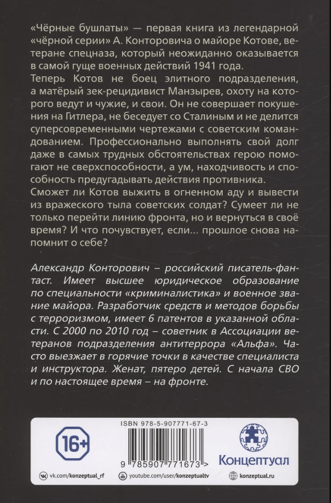 "Black Pea Coats" is the first book in A. Kontorovich's legendary "black series" about Major Kotov, a special forces veteran who unexpectedly finds himself transported back in time to the very heart of military action in 1941. This book tells the story of a time traveler whose fate is radically altered: now Kotov is no longer a fighter in an elite unit, but a hardened prisoner and recidivist named Manzyrev, hunted by both enemies and his own. He doesn't attempt to assassinate Hitler, doesn't converse with Stalin, and doesn't share cutting-edge blueprints with the Soviet command. It's not superpowers that help the hero professionally fulfill his duty, even in the most difficult circumstances, but his intelligence, resourcefulness, and ability to anticipate enemy actions. Will Kotov be able to survive the fiery inferno and lead Soviet soldiers from behind enemy lines? Will he be able not only to cross the front lines but also to return to his own time? And what will he feel if... the past reminds him of itself again?