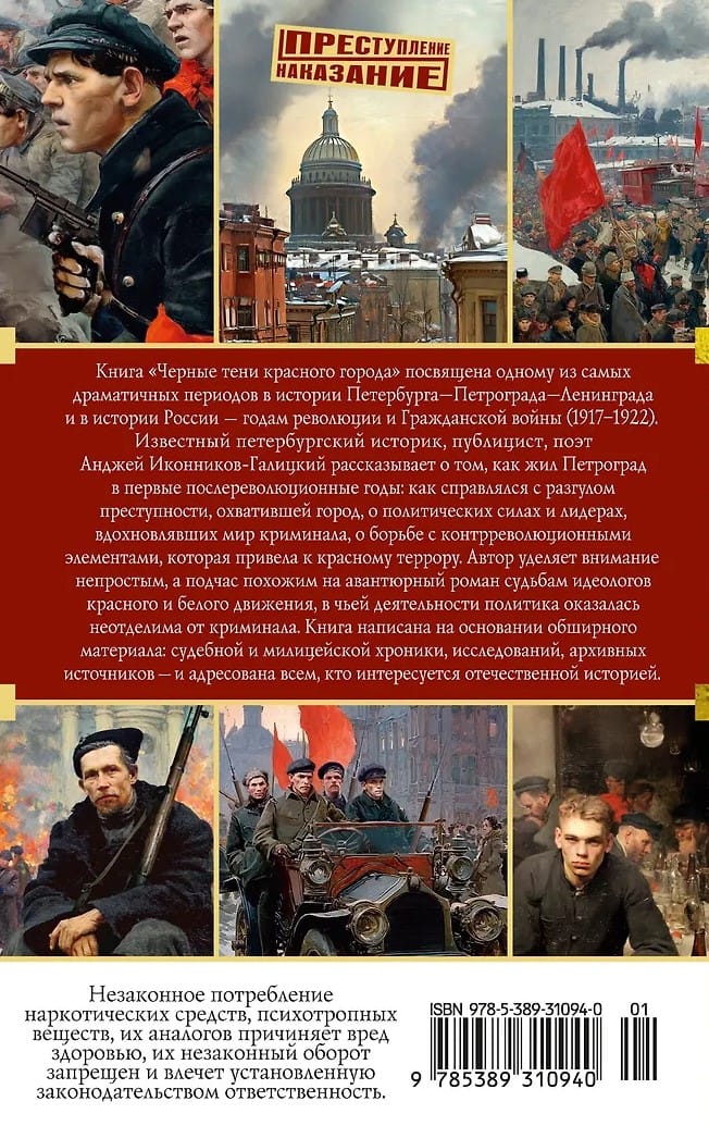 The book "Black Shadows of the Red City" is dedicated to one of the most dramatic periods in the history of St. Petersburg, Petrograd, and Leningrad, and in the history of Russia—the years of the Revolution and Civil War (1917–1922). Renowned St. Petersburg historian, publicist, and poet Andrzej Ikonnikov-Galitsky recounts life in Petrograd in the first post-revolutionary years: how it coped with the rampant crime that engulfed the city, the political forces and leaders who inspired the criminal underworld, and the struggle against counterrevolutionary elements that led to the Red Terror. The author focuses on the difficult, sometimes adventure-novel-like, fates of the ideologists of the Red and White movements, whose activities were inseparable from politics and crime. The book draws on extensive material—court and police records, research, and archival sources—and is intended for anyone interested in Russian history.