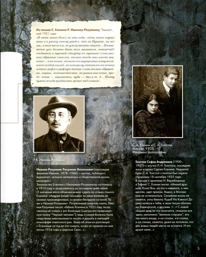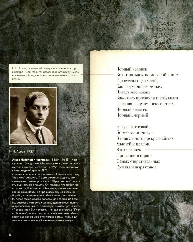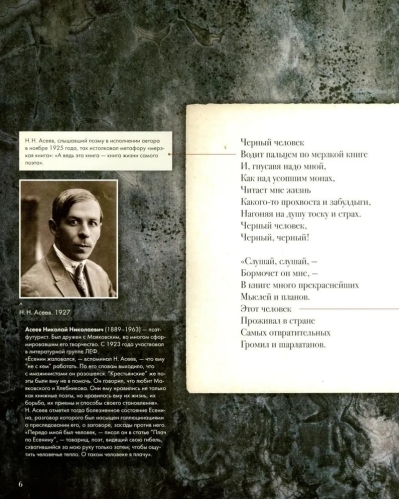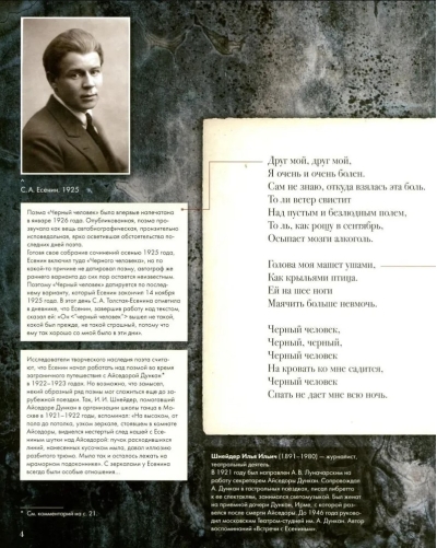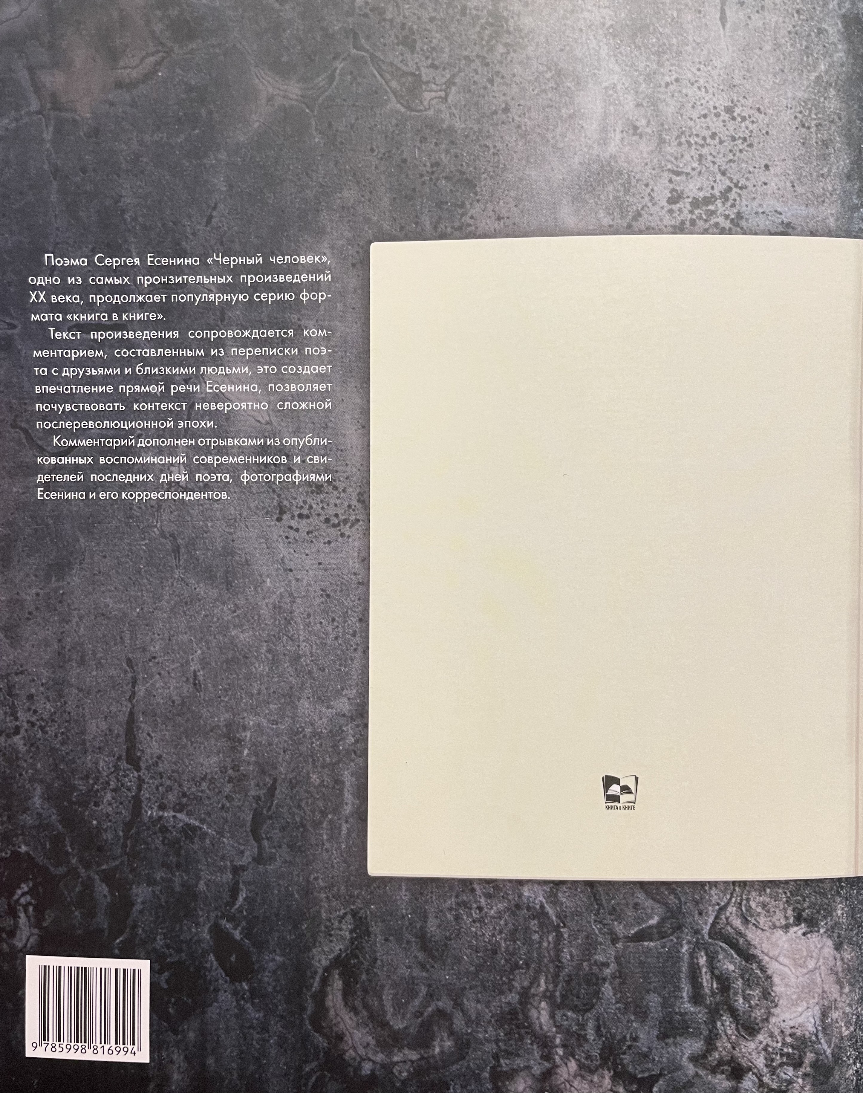 Sergei Yesenin's poem "The Black Man," one of the most poignant works of the 20th century, continues the popular "book-within-a-book" series. The text is accompanied by commentary compiled from the poet's correspondence with friends and loved ones, creating the impression of Yesenin's direct speech and providing a sense of the incredibly complex post-revolutionary era. The commentary is supplemented by excerpts from published memoirs of contemporaries and witnesses to the poet's final days, as well as photographs of Yesenin and his correspondents.