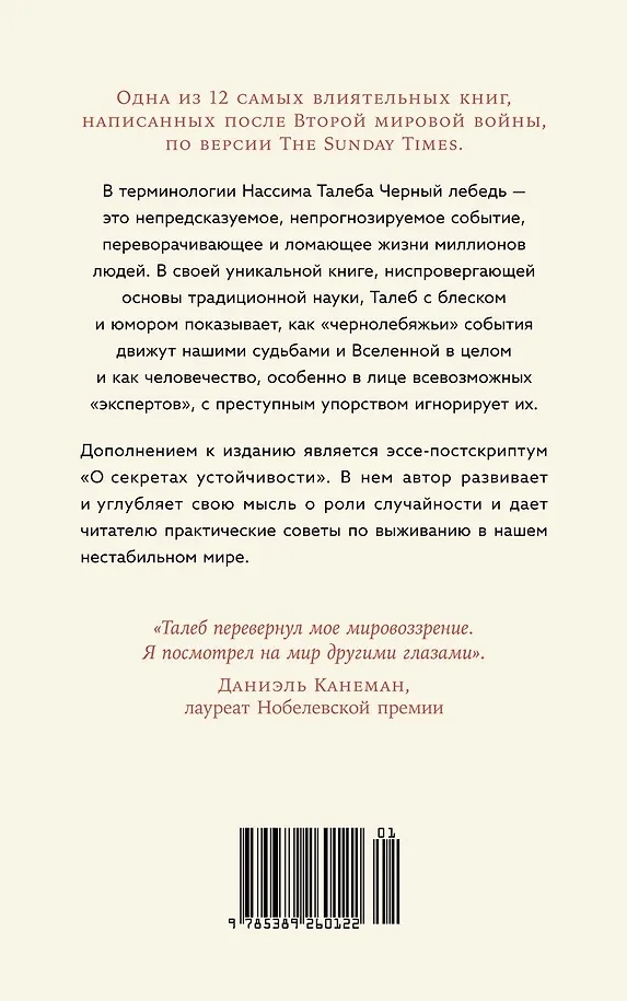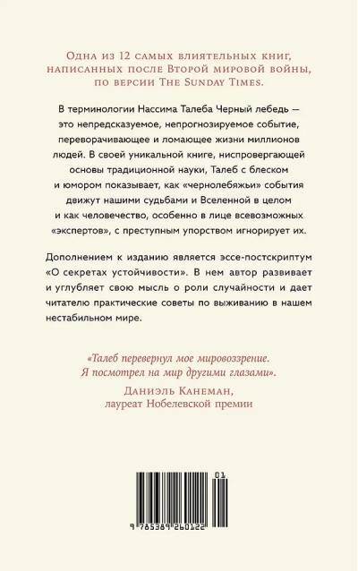 In the last decade alone, humanity has experienced a series of devastating catastrophes, upheavals, and cataclysms that defy even the most fantastical predictions. Sorbonne graduate and New York financial guru Nassim Taleb calls such unpredictable events "Black Swans." He is convinced that they are the driving force behind both history as a whole and the existence of each individual. And to succeed, one must be prepared for them.