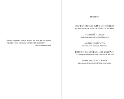 Immediately after the publication of "The Black Swan," the author brilliantly demonstrated his "non-theory" in practice: amid the financial crisis, Taleb's company earned (not lost!) half a billion dollars for investors. But his work is not an economics textbook. It is the reflections of an extraordinary man on life and how to find one's place in it.