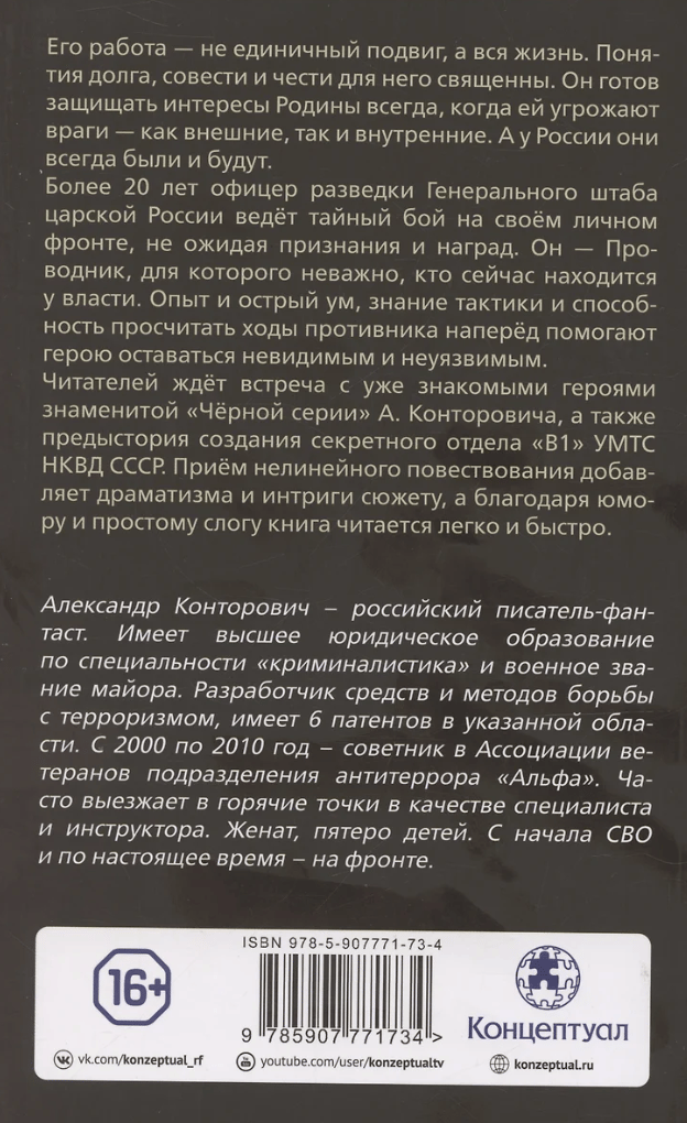His work is not a single feat, but his entire life. The concepts of duty, conscience, and honor are sacred to him. He is ready to defend the interests of the Motherland whenever it is threatened by enemies—both external and internal. And Russia always has had them, and always will. For over 20 years, this intelligence officer of the General Staff of Tsarist Russia has waged a secret battle on his personal front, without expecting recognition or reward. He is a Conductor, for whom whoever is in power is irrelevant. Experience and a keen mind, knowledge of tactics, and the ability to anticipate the enemy's moves help the hero remain invisible and invulnerable. Readers will encounter familiar characters from A. Kontorovich's famous "Black Series," as well as the backstory of the creation of the secret Department "B1" of the UMTS NKVD of the USSR. The non-linear narrative technique adds drama and intrigue to the plot, and the humor and simple style make the book an easy and quick read.