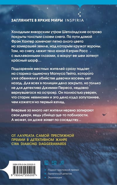 On a cold January morning, the Shetland Islands are covered in a thick layer of snow. On her way home, Fran Hunter notices a scarlet patch on the frozen ground, over which crows are circling. There, in the snow, lies the body of young Katherine Ross, her eyes pecked out, a red scarf wrapped around her neck...