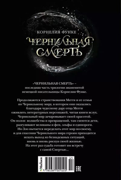 "Ink Death" is the last part of the trilogy of the famous German writer Cornelia Funke. Meggie and her family continue their wanderings through the Inky World, in which they found themselves thanks to the miraculous gift of Meggie's father to bring literary characters to life by reading books aloud. Inkworld is mesmerizing in its beauty. It is full of magic and transformation, children laugh there, giants and fairies, elves and unicorns walk around. But Evil is trying to remake this world in its own way, and to save the Inky World the heroes have to find a way out of hopeless situations, again and again risking their lives. This time fate prepares them to meet Death himself...