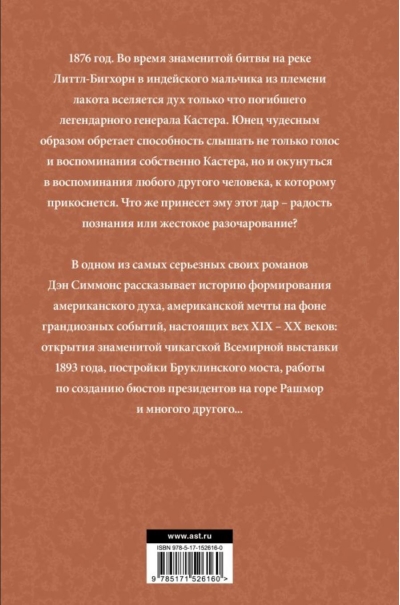 In one of his most serious novels, Dan Simmons tells the story of the formation of the American spirit, the American dream against the backdrop of grandiose events, real milestones of the XIX - XX centuries: the opening of the famous Chicago World's Fair in 1893, the construction of the Brooklyn Bridge, work on the creation of busts of presidents on Mount Rushmore and much more....