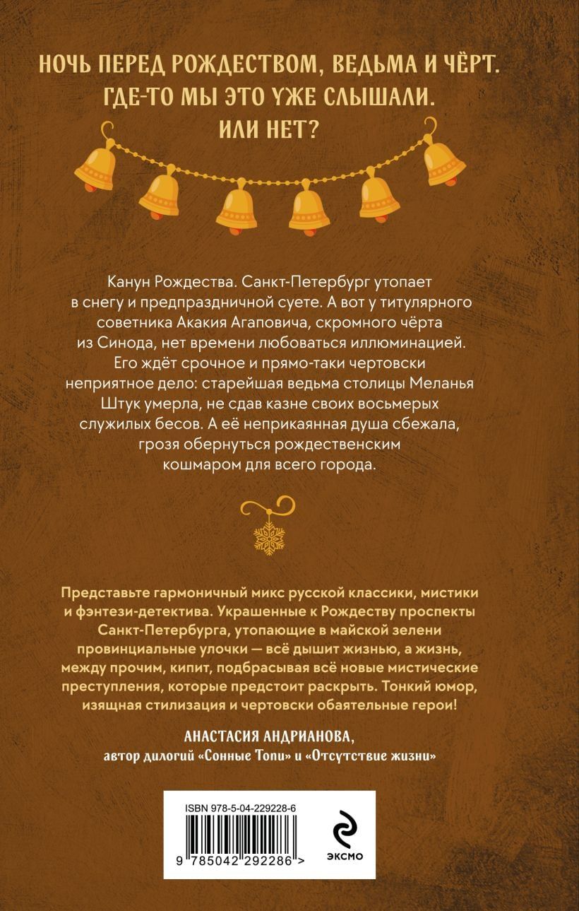 It's Christmas Eve. St. Petersburg is buried in snow and pre-holiday bustle. But Titular Councilor Akakiy Agapovich, a humble devil from the Synod, has no time to admire the illuminations. He has urgent, and downright devilishly unpleasant, business to attend to: the capital's oldest witch, Melania Shtuk, has died without surrendering her eight serving devils to the treasury. And her restless soul has escaped, threatening to turn into a Christmas nightmare for the entire city.