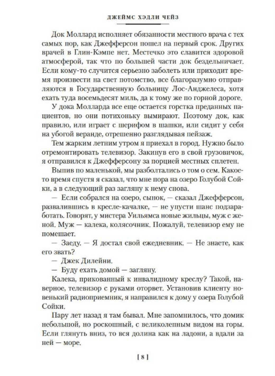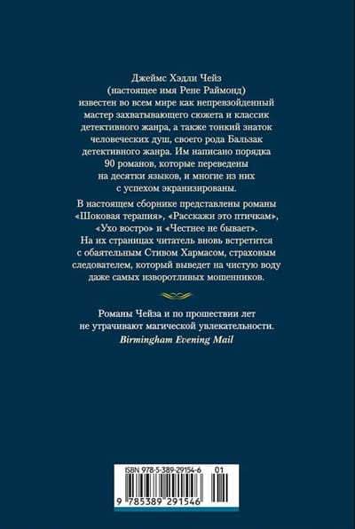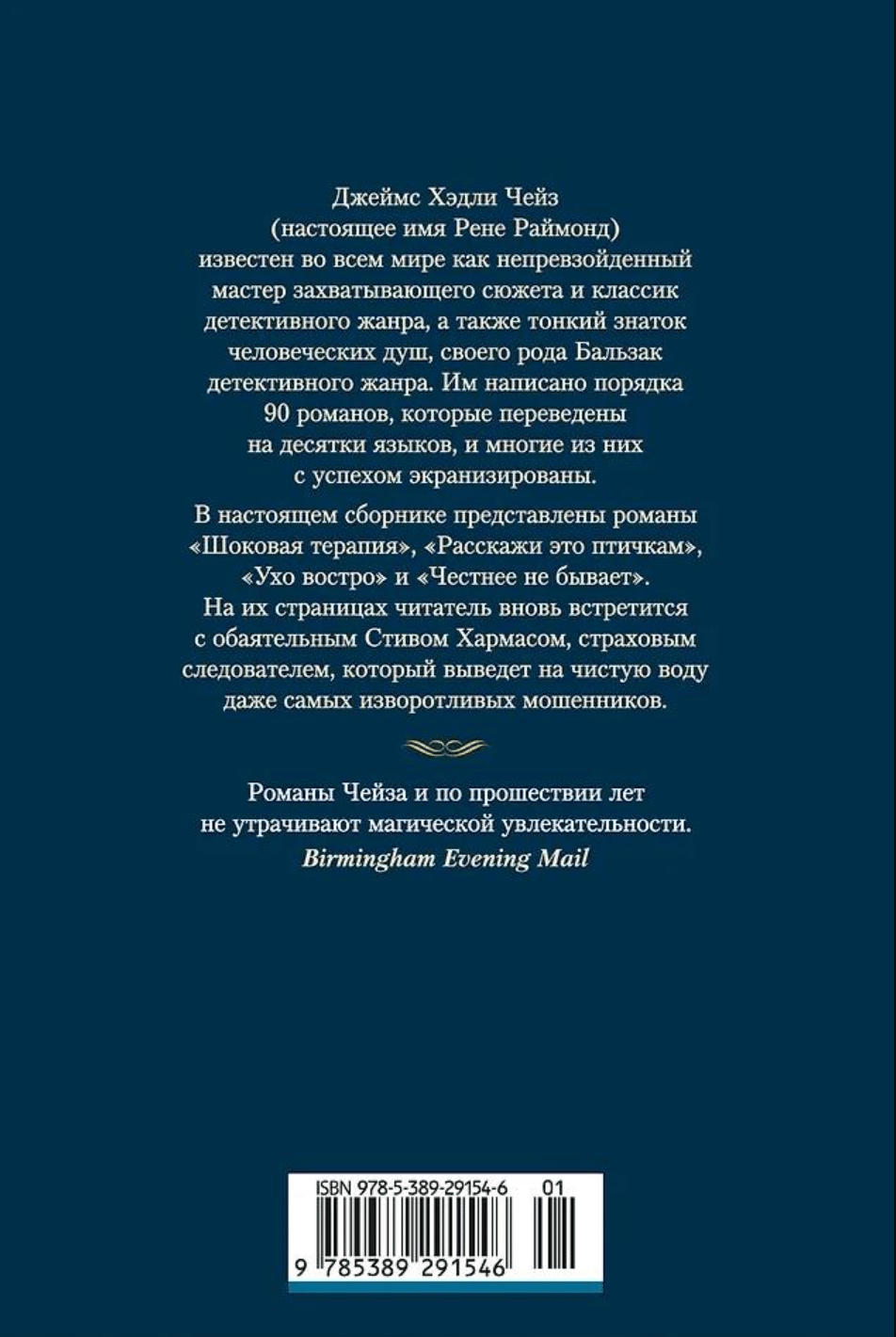 James Hadley Chase is known throughout the world as an unrivaled master of a gripping plot and a classic of the detective genre, as well as a subtle connoisseur of human souls, a kind of Balzac of the detective genre. Over half a century of writing, he created about 90 novels, which have been translated into dozens of languages, and many of them have been successfully filmed. This collection includes the novels Shock Therapy, Tell It to the Birds, Keep Your Eyes Open, and As Honest As It Gets. On their pages, the reader will once again meet the charming Steve Harmas, an ironic and insightful insurance investigator who will bring even the most dodgy swindlers to justice.