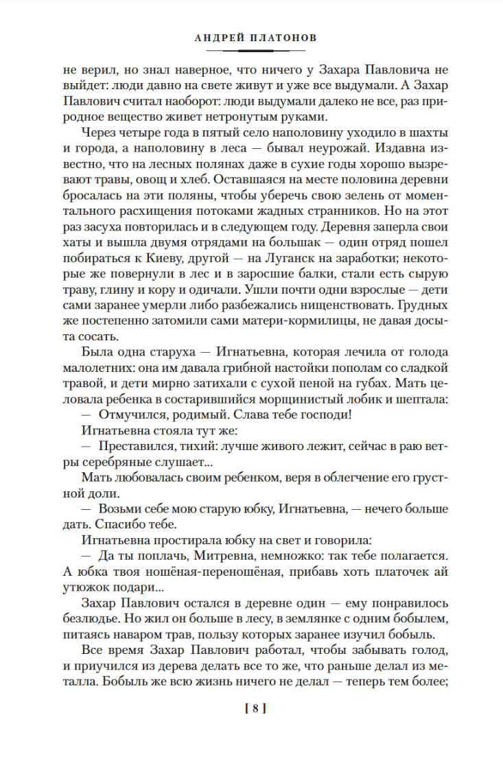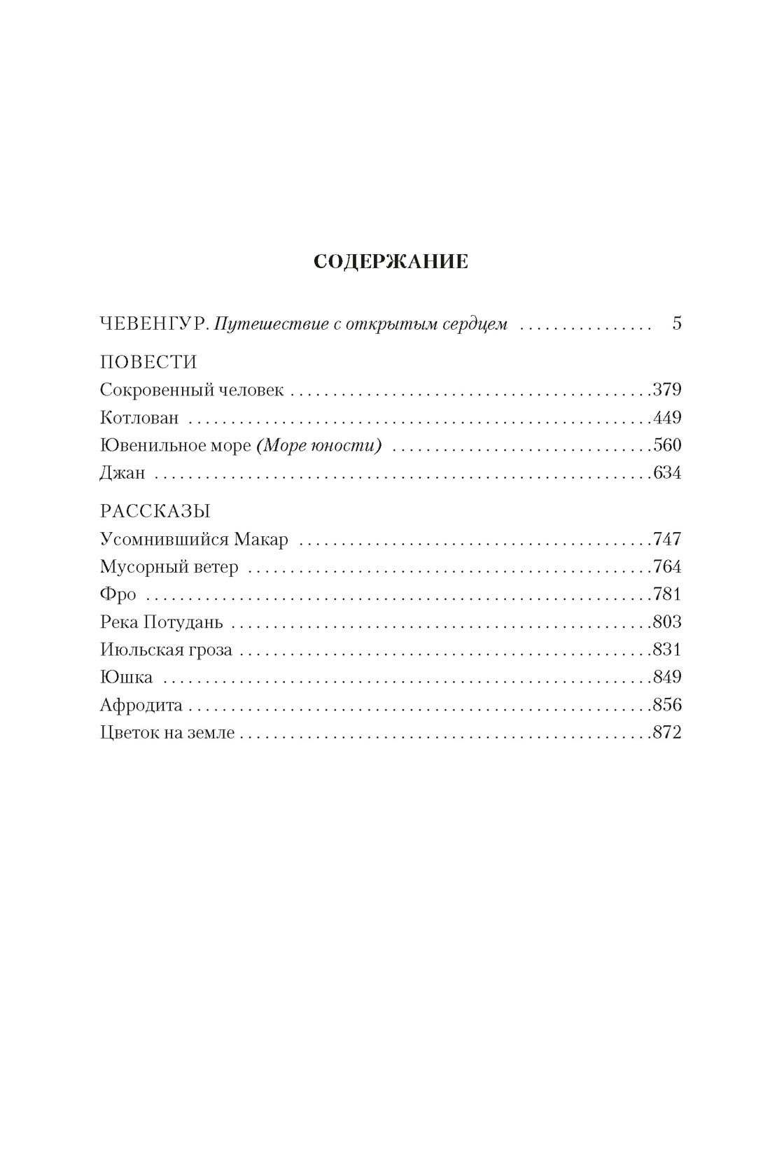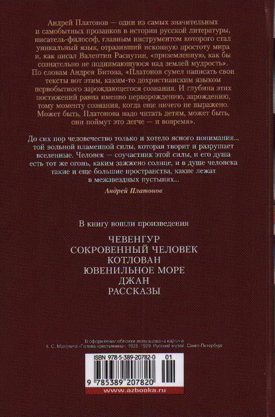 Andrei Platonov is one of the most significant and original prose writers in the history of Russian literature, a writer-philosopher, whose main tool was a unique language that reflected the original simplicity of the world and, as Valentin Rasputin wrote, "a down-to-earth, as if consciously not rising above the earth wisdom". According to Andrei Bitov, "Platonov managed to write his texts in this, some pre-Christian language of primitive emerging consciousness. ...Maybe Platonov should be read to children, maybe they will understand it more easily - and in time". This edition presents the most famous and significant works of Andrei Platonov, including the novel "Chevengur", the novels "Kotlovan", "The Hidden Man", "The Juvenile Sea", the stories "The Potudan River", "Fro", "Flower on the Earth", and others.