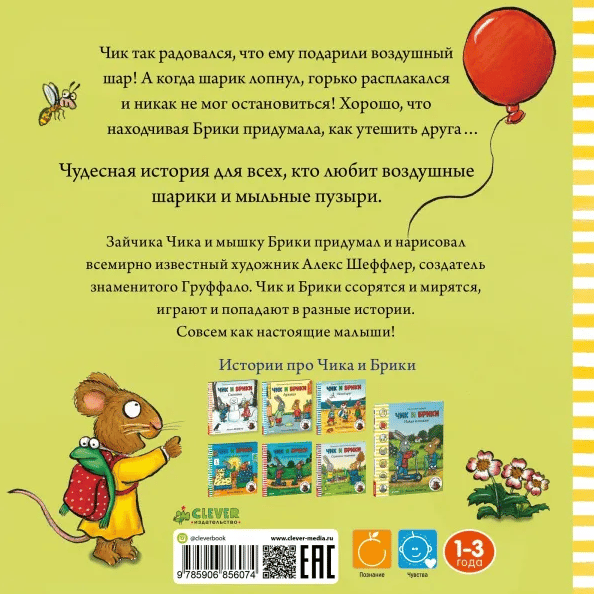 Chick was so happy that he had been given a balloon! But when the balloon burst, he cried bitterly and couldn't stop! Good thing that resourceful Briki came up with a way to comfort his friend... A wonderful story for everyone who loves balloons and soap bubbles. Chick the bunny and Briki the mouse were invented and drawn by the world famous artist Alex Scheffler, the creator of the famous Gruffalo. Chick and Briki fight and make peace, play and get into different stories. Just like real babies!