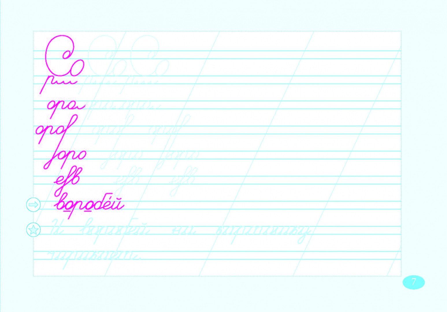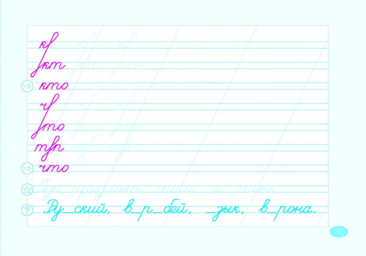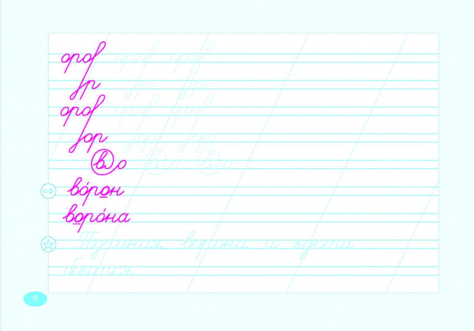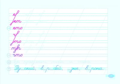 Penmanship and Vocabulary Words is a teaching aid aimed at forming calligraphic skill in junior schoolchildren. It is linked to the lesson topics, connected with vocabulary words. The basis of penmanship is made up of strokes (each page starts with them). They are aimed at practicing the connections of letters, which further form the basis of the vocabulary word(s). Work with the vocabulary word is conducted according to the methodology of teaching Russian language in primary grades (lesson topic). At the bottom of the page is given a proverb in which the word under study is included. The pale color should be circled (stroke and proverbs).