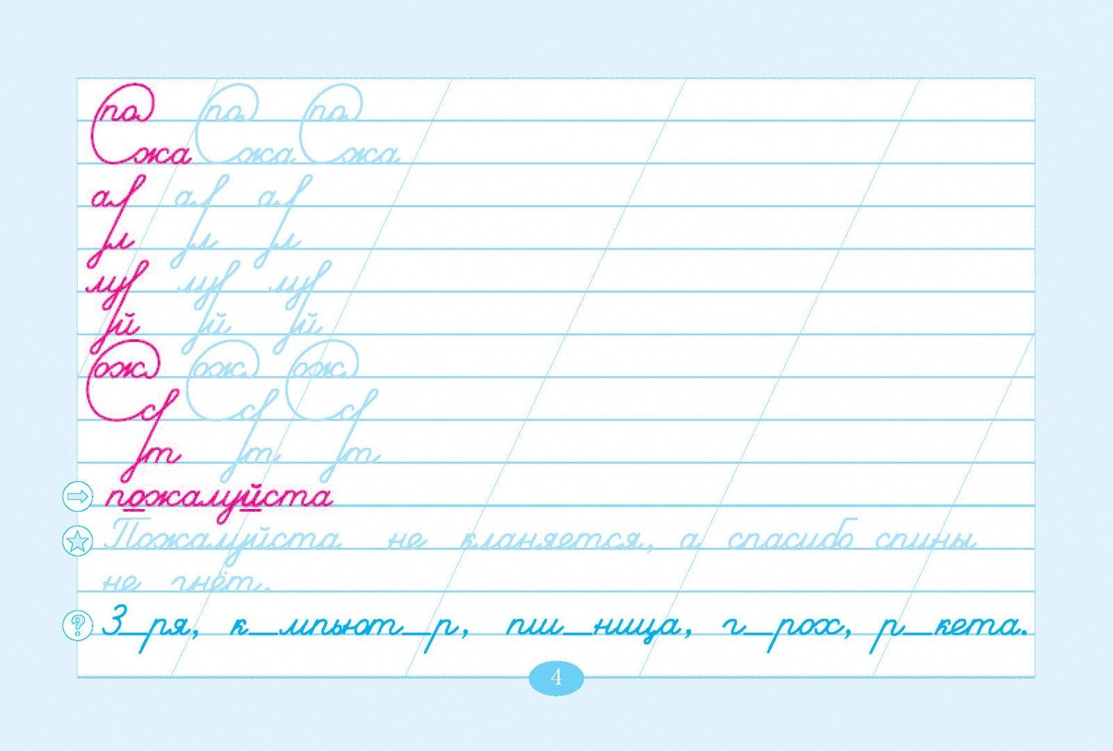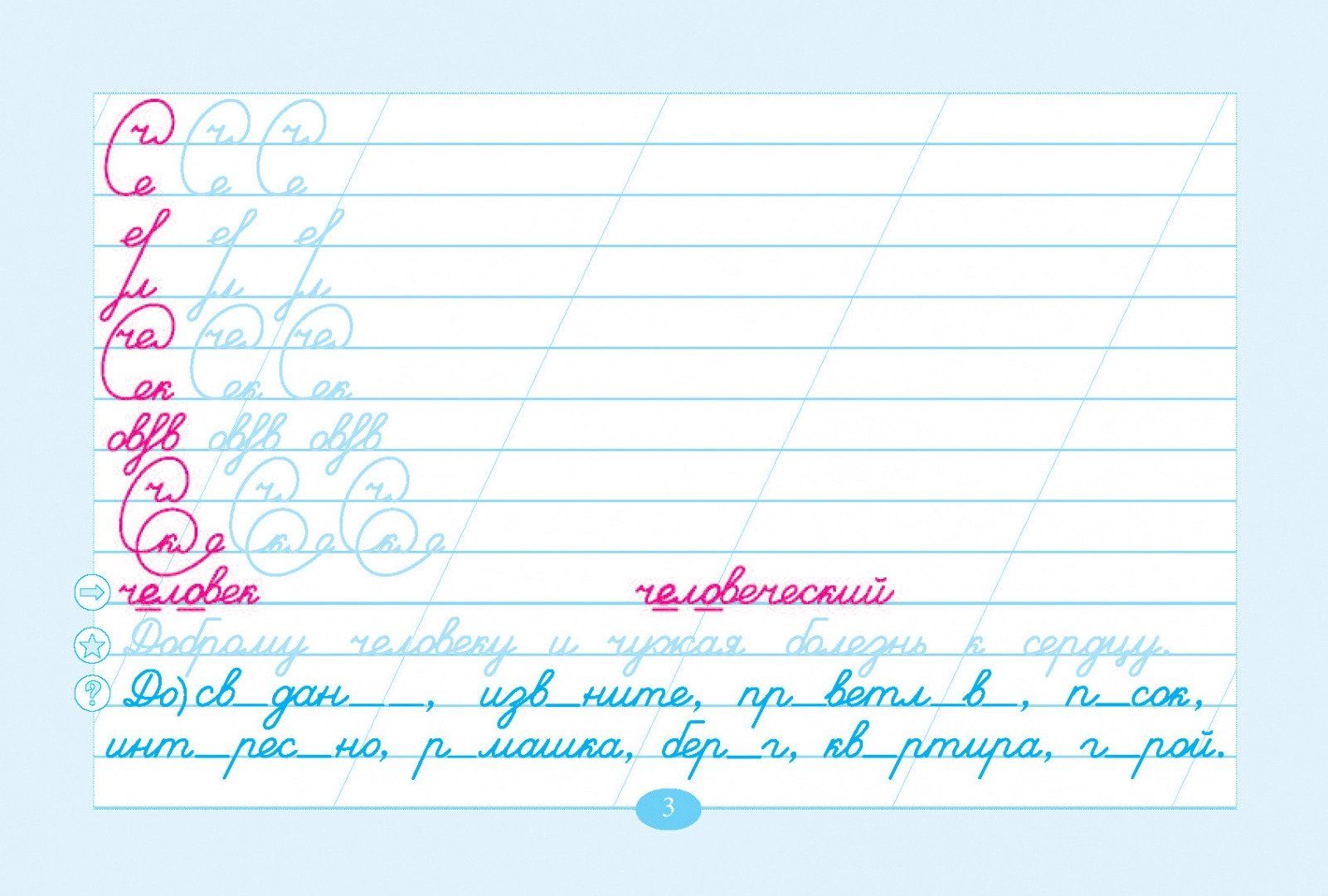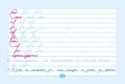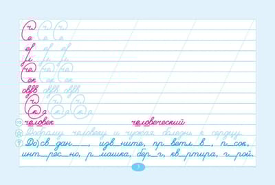 "Penmanship and Vocabulary Words" is a teaching aid aimed at forming calligraphic skill in junior schoolchildren. It is linked to the lesson topics, connected with vocabulary words. The basis of penmanship is made up of strokes (each page starts with them). They are aimed at practicing the connections of letters, which further form the basis of the vocabulary word(s). Work with the vocabulary word is conducted according to the methodology of teaching Russian language in primary grades (lesson topic). At the bottom of the page is given a proverb in which the word under study is included. The pale color should be circled (stroke and proverbs).