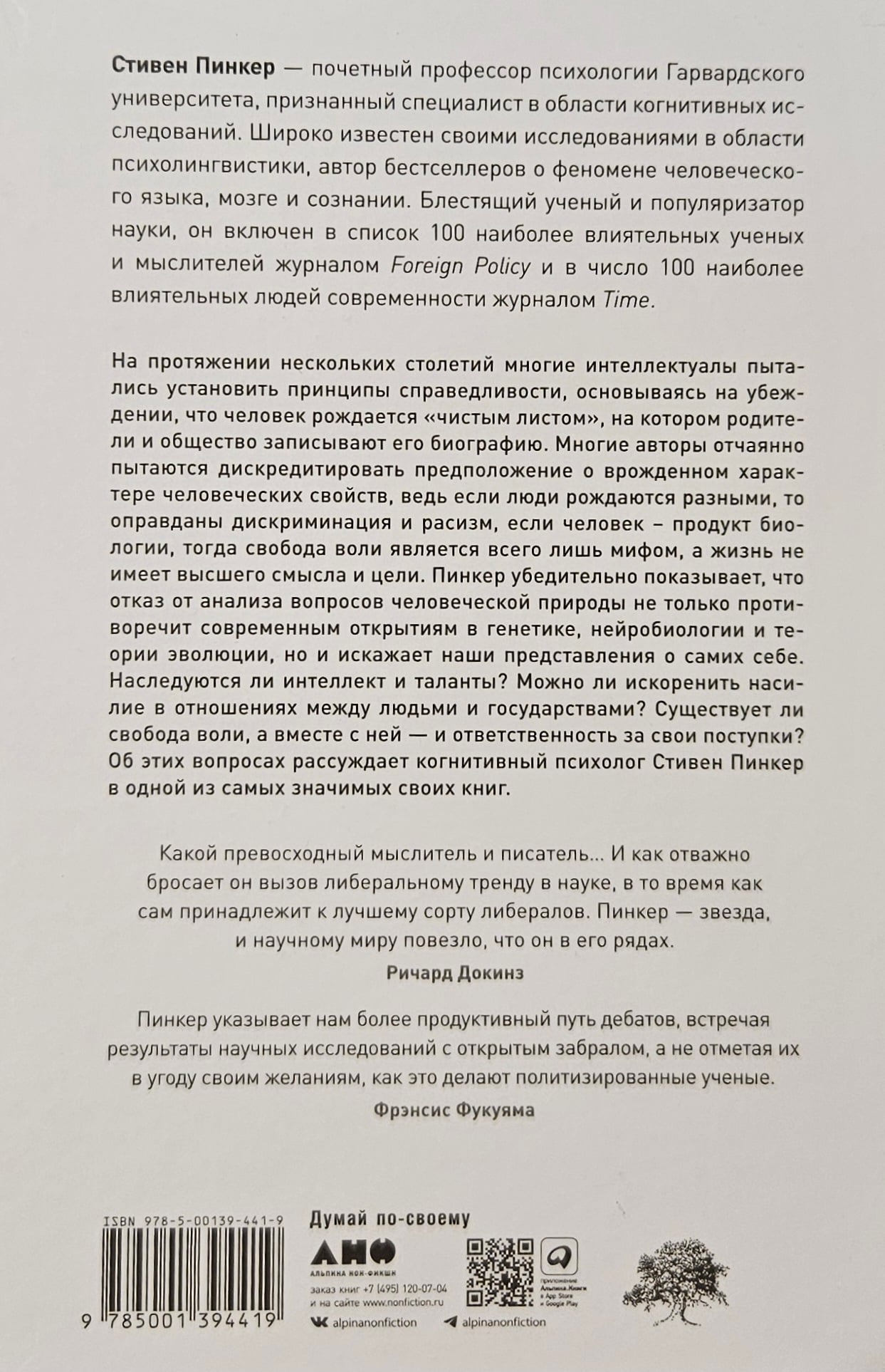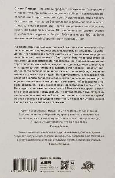 For several centuries, many intellectuals have tried to establish principles of justice based on the belief that human beings are born a "blank slate" on which parents and society record their biography. Many authors have tried desperately to discredit the assumption that human characteristics are innate, for if people are born different, then discrimination and racism are justified, if man is a product of biology, then free will is a mere myth, and life has no higher meaning or purpose. Pinker convincingly shows that refusing to analyze questions of human nature not only contradicts modern discoveries in genetics, neurobiology, and evolutionary theory, but also distorts our ideas about ourselves. Are intelligence and talents inherited? Can violence between individuals and nations be eradicated? Is there free will, and with it, responsibility for one's actions? Cognitive psychologist Steven Pinker discusses these questions in one of his most important books.