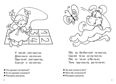 This workbook is designed for children who know all the letters and are beginning to read. Each page contains engaging text in verse, with each word divided into syllables and accompanied by a picture to color. Children also have to answer questions, which helps develop coherent speech.
