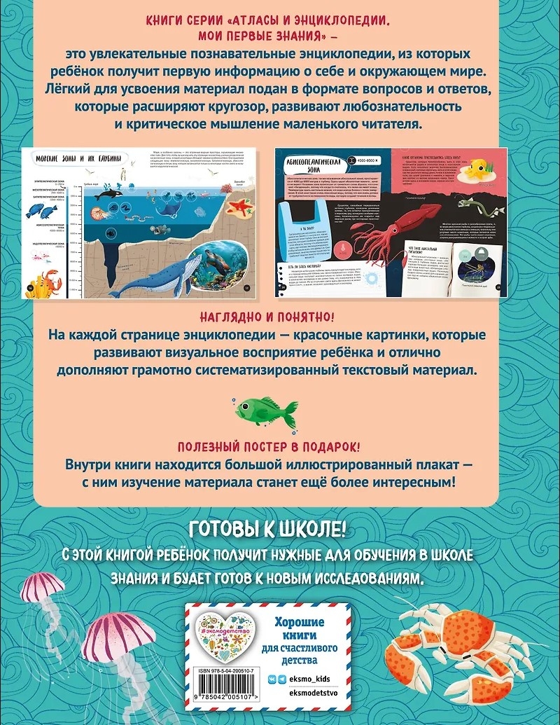 A question-and-answer encyclopedia created specifically for preschoolers. Instead of long, scientific articles, it offers visual, easy-to-understand, and engaging stories about the seas and oceans, plus a large poster included. Amazing ocean records, marine life, unusual underwater places and phenomena—everything your little inquisitive mind wants to know and loves to ask about!