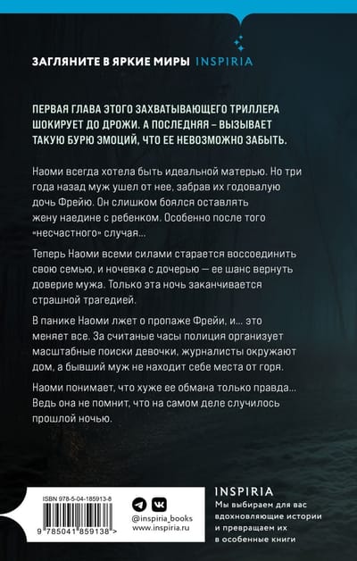 The first chapter of this gripping thriller is shocking to the point of shivering. And the last one - causes such a storm of emotions that it is impossible to forget it. "I tried very hard to remember the events of that night. To remember anything: the scream in the dark, Freya calling me... Nothing. Nothing but darkness." Naomi always wanted to be the perfect mother. But three years ago her husband left her, taking their one-year-old daughter Freya. He was too afraid to leave his wife alone with the baby. Especially after that "accident"... Now Naomi tries her best to reunite her family, and a sleepover with her daughter is her chance to regain her husband's trust. Only this night ends in a terrible tragedy. In a panic, Naomi lies about Freya's disappearance, and... it changes everything. In a matter of hours, the police organize a large-scale search for the girl, journalists surround the house, and her ex-husband finds no place from grief. Naomi realizes that the only thing worse than her deception is the truth... After all, she doesn't remember what really happened last night.