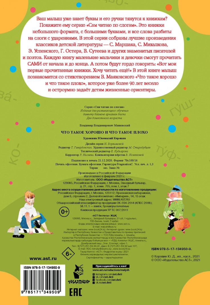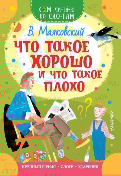 Does your little one already know the letters and his hands are reaching for the books? Show him the "I read by syllables myself" series. These are small-format books with large letters, and all words are broken down into syllables with accents. This series contains the best works of the classics of children's literature - S. Marshak, S. Mikhalkov, E. Uspensky, G. Oster, V. Suteyev and other famous writers and poets. Each book little boys and girls will be able to read themselves from beginning to end. And then they will proudly say: "Here are my first read books. I want to read more!" In this book, the baby will get acquainted with the poem by V. Mayakovsky. Mayakovsky "What is good and what is bad", which for more than 90 years cheerfully and wittily set children life guidelines.