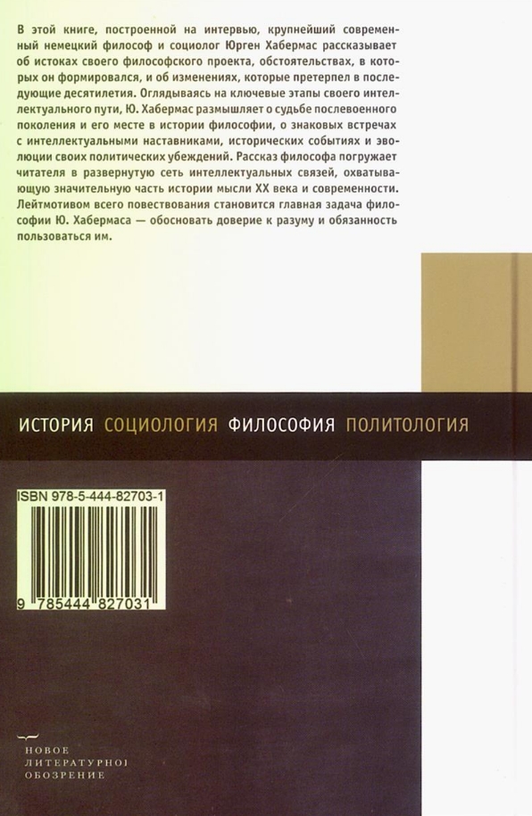 In this book, based on interviews, the leading contemporary German philosopher and sociologist Jürgen Habermas recounts the origins of his philosophical project, the circumstances in which it took shape, and the changes it underwent in the decades that followed. Looking back at key stages of his intellectual journey, Habermas reflects on the fate of the post-war generation and its place in the history of philosophy, significant encounters with intellectual mentors, historical events, and the evolution of his political convictions. The philosopher's narrative immerses the reader in a vast network of intellectual connections spanning a significant portion of the history of 20th-century and contemporary thought. The leitmotif of the entire narrative is the central task of Habermas's philosophy—to justify trust in reason and the duty to use it.