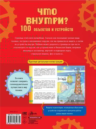 Colorful encyclopedia for children "What's Inside? 100 objects and devices" will tell not only about different types of equipment: from a car, airplane, tank and armored personnel carrier to a washing machine, refrigerator, hair dryer and vacuum cleaner, but also will take a tour inside unusual buildings and structures. You will learn how the Pyramid of Cheops and the Spasskaya Tower are organized, what size the chimes are, why the Leaning Tower of Pisa tilts to the south, how a wind generator and a windmill work, which tower is the tallest in the world, what a Fresnel lens is and much more.