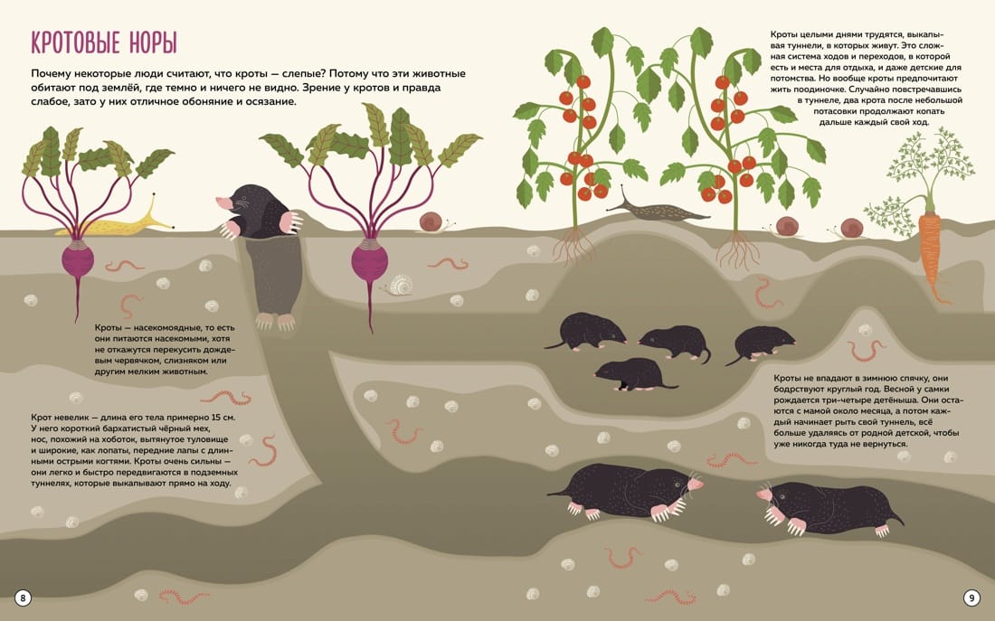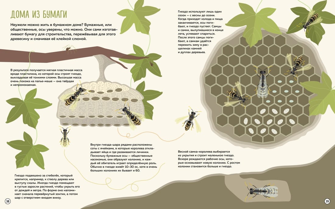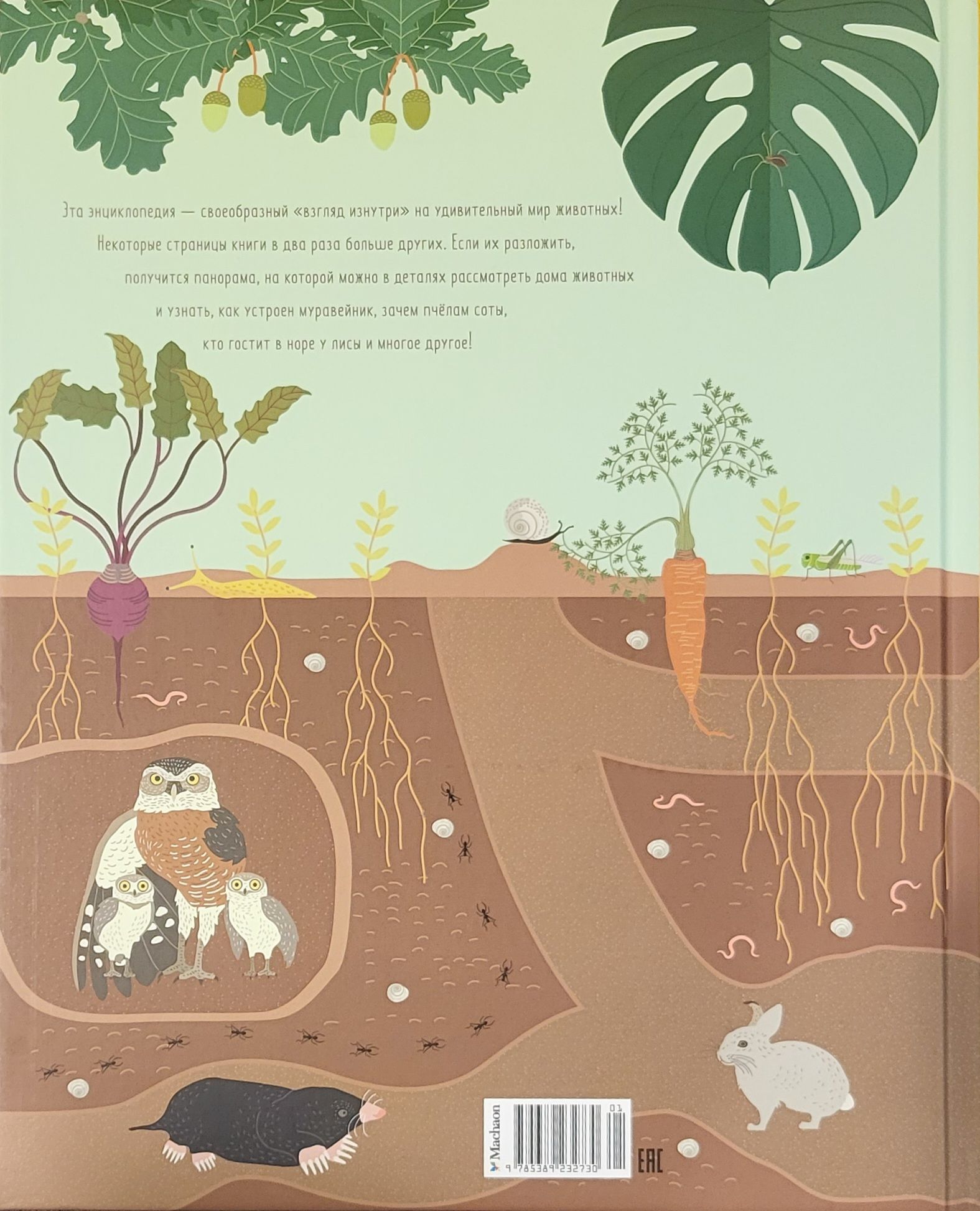 This encyclopedia is a kind of "inside look" at the amazing world of animals. Some pages of the book are twice as big as others. If you unfold them, you will get a panorama where you can see the houses of animals in detail and learn how an anthill is organized, why bees need honeycombs, who stays in the fox's burrow, and much more.