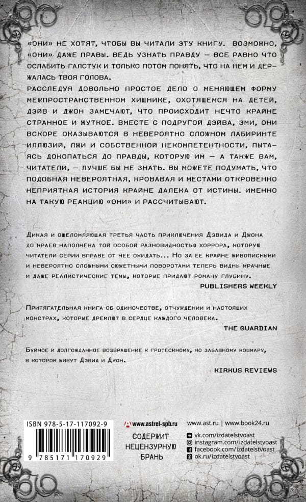 "They" don't want you to read this book. Maybe they're right. After all, finding out the truth is like loosening your tie and only later realizing that it was the tie that held up your head. While investigating a fairly simple case of a shape-shifting interdimensional predator preying on children, Dave and John notice that something extremely strange and creepy is going on. Together with Dave's friend Amy, they soon find themselves caught up in an incredibly complex maze of illusions, lies, and their own incompetence as they try to get to the truth that they-and you, the readers-would rather not know. You may think that such an incredible, bloody and in some places frankly unpleasant story is far from the truth. That is exactly the reaction "They" are counting on.