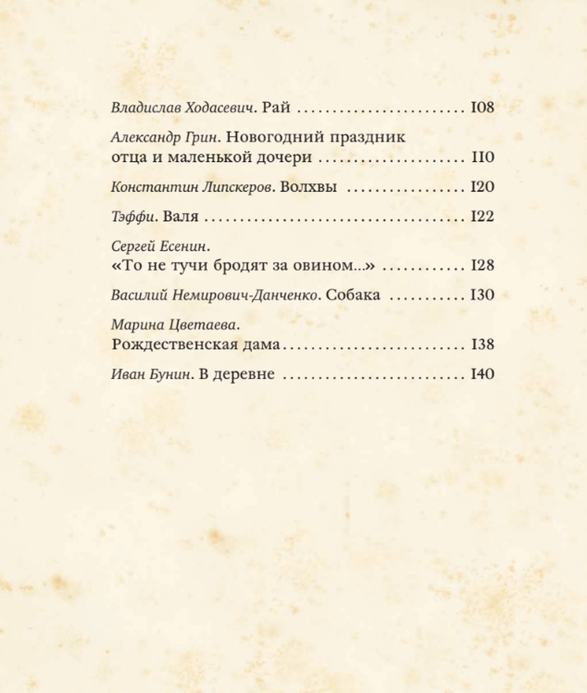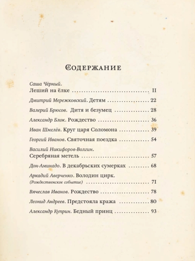 This book contains works dedicated to Christmas and the Holy Week by A. Blok, S. Yesenin, G. Ivanov, L. Andreyev, V. Bryusov, A. Averchenko, I. Shmelev, V. Khodasevich, M. Tsvetaeva, A. Grin, V. Nikiforov-Volgin, V. Ivanov, V. Nemirovich-Danchenko, Sasha Cherny, Don Aminado, and Teffi.
