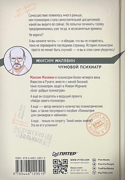 Author Maxim Malyavin has been in psychiatry for more than a quarter of a century. He is well-known in Runet, together with his wife Oksana, also a psychiatrist, he runs the "Blog of Good Psychiatrists" in LiveJournal. He is also the creator and host of the project "Find Your Psychiatrist". He is also the author of quite a few psychiatric tales, as well as a popular manual "Psychiatry for Samovars and Dummies". And also... just in confidence: do you know the Pacific Ocean? He's the one who calmed him down.