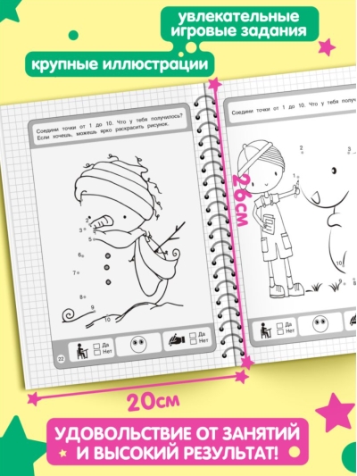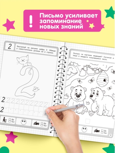This book from Eksmo Publishing House is a real find for parents whose children will soon be entering first grade. This resource, which complies with the Federal State Educational Standard, is clearly structured and ideal for introducing numbers to preschoolers, as these initial concepts are simultaneously developing graphic skills. Writing numbers helps children remember them better. Large, engaging pictures will motivate them. While working, preschoolers will memorize the images of numbers, trace their outlines, write independently, and count. At the bottom of each page, there are icons for assessing completed tasks. By checking the "yes" or "no" boxes, children can check their progress, and by drawing the smiley face's mouth up or down, they can evaluate their performance (good/not so good). Regular use of this resource will help preschoolers develop fine motor skills, graphic skills, attention, creativity, and become more assiduous and accurate.