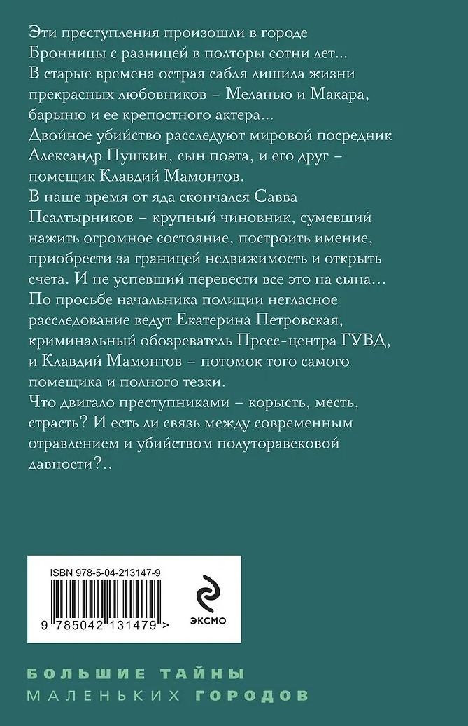 In our time, Savva Psaltyrnikov, a high-ranking official who managed to amass a vast fortune, build an estate, acquire real estate abroad, and open bank accounts, died of poison. And he failed to transfer all of this wealth to his son... At the request of the chief of police, a secret investigation is being conducted by Ekaterina Petrovskaya, a crime reporter for the Main Directorate of Internal Affairs Press Center, and Klavdy Mamontov, a descendant of the same landowner and a full namesake.