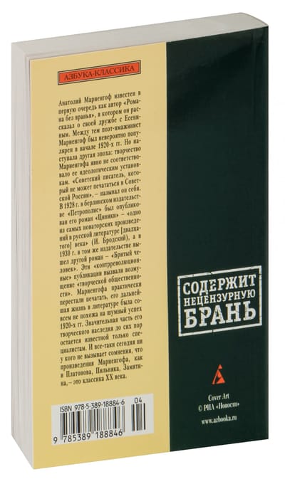First published abroad by the Berlin publishing house Petropolis ("Cynics" in 1928, "The Shaved Man" in 1930), Mariengof's works were deemed "antisocial" in Soviet Russia. For many years, his name "dropped out" of the literary scene. Russian readers only had the opportunity to read "Cynics" in 1988, while "The Shaved Man" was first published in Russia in 1991. In 1991, Dmitry Meskhiev made a film based on "Cynics." Today, no one doubts that Mariengof's creative legacy, like that of Platonov, Pilnyak, and Zamyatin, is a classic of the 20th century.