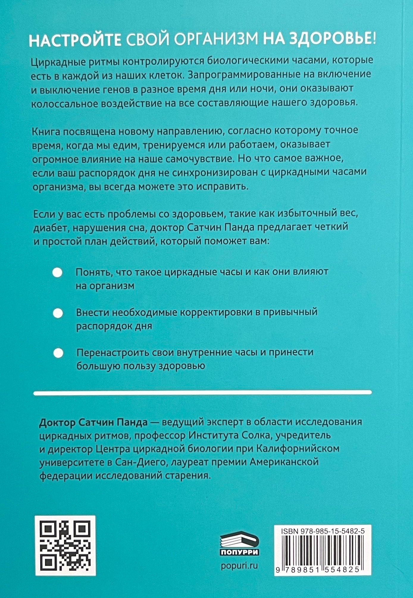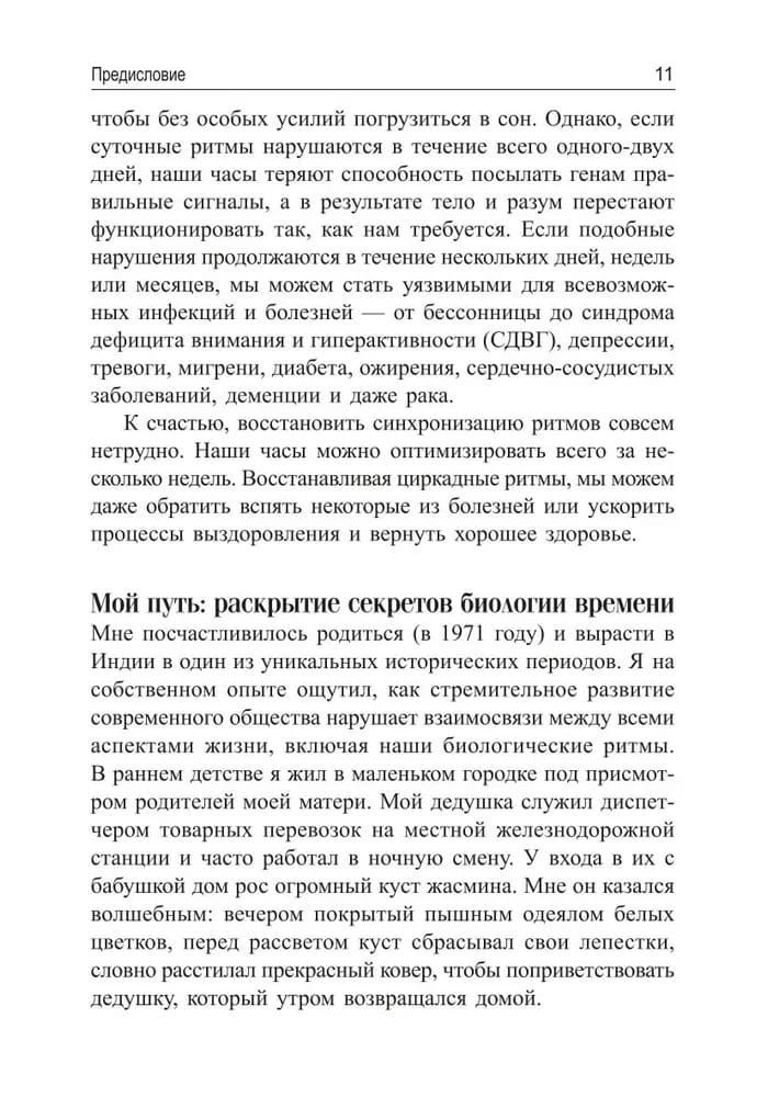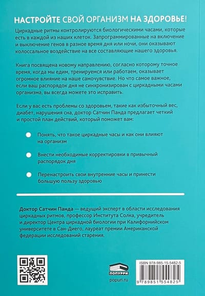 Circadian rhythms are controlled by the biological clocks found in each of our cells. Programmed to turn genes on and off at different times of the day or night, they have a tremendous impact on all components of our health. The book focuses on the new trend that the exact time we eat, exercise or work has a huge impact on our well-being. But most importantly, if your daily routine is out of sync with your body's circadian clock, you can always fix it. If you have health issues such as overweight, diabetes, sleep disorders, Dr. Satchin Panda offers a clear and simple action plan that will help you: - Understand what the circadian clock is and how it affects the body - Make the necessary adjustments to your daily routine - Recalibrate your internal clock and reap greater health benefits