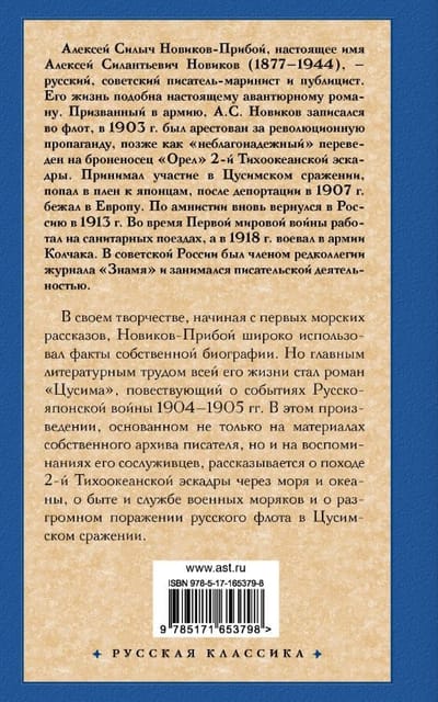 Alexey Novikov-Priboy, a Russian and Soviet marine writer and publicist, served as a sailor on the battleship "Oryol" and participated in the Battle of Tsushima. The author spent his entire life collecting unique materials for this book, which helped him faithfully describe the daily life, courage, and heroism of Russian sailors. The book combines the virtues of masterful style, accessible language, and high-quality documentary writing.
