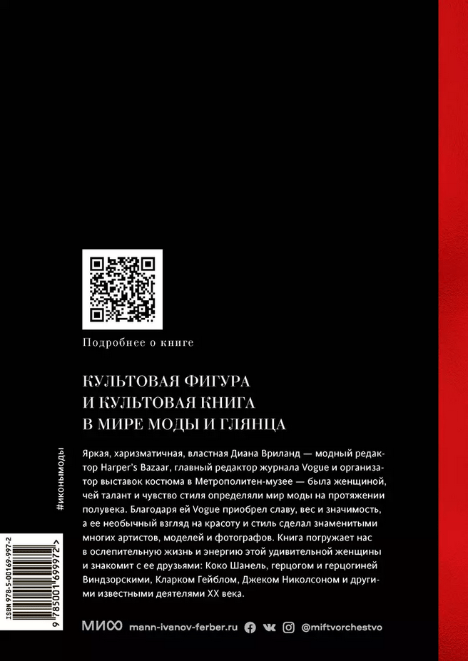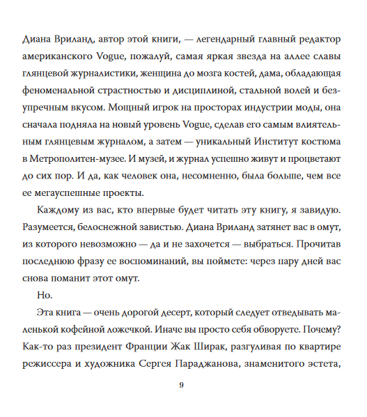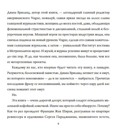 This book is the mesmerizing autobiography of one of the greatest fashion icons of the twentieth century, Diana Vreeland, fashion editor of Harpers Bazaar and editor-in-chief of Vogue, whose incomparable sense of style and talent defined the world of haute couture for fifty years. Vibrant, distinctive, charismatic Diana Vreeland proves herself a brilliant storyteller, taking us into her dazzling and turbulent life and presenting to our imagination the opulence and vibrancy of an era that produced Queen Mary of England, Buffalo Bill, Sergei Diaghilev, Clark Gable and Coco Chanel.