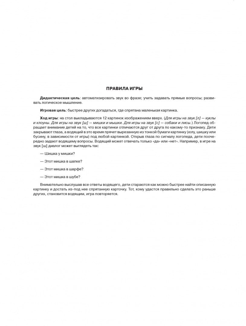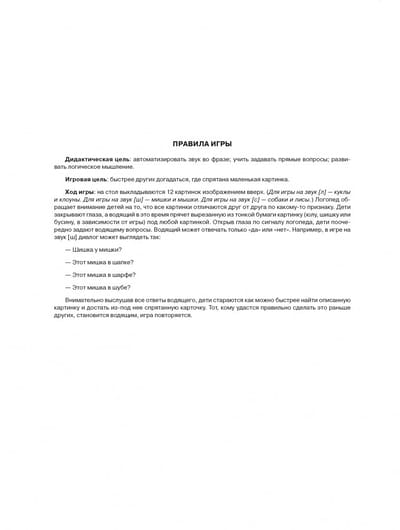 Speech therapy game for preschoolers is primarily designed for automatization of sounds and development of general speech skills: the ability to ask direct questions, listen and hear the interlocutor; as well as for the development of higher mental functions of preschoolers: visual and auditory attention, logical thinking. In addition to didactic tasks, the game has a playful task, which makes it attractive for children, increasing their motivation. Bright pictures, created by a wonderful St. Petersburg children's artist, will appeal to children and make the game with cards not only useful, but also exciting. The manual is designed for children of middle and senior preschool age (from 4 to 7 years old), but can be used in elementary school. It is recommended for teachers of preschools, educators and parents of preschoolers.