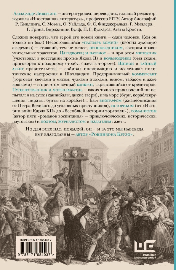 It is hard to believe that the hero of his new book is one person. Whatever he was! The failed “shepherd of God” (he abandoned the theological academy) became a preacher and author of moralizing treatises. The tsar and patriot - and at the same time a rebel (participated in the uprising against Jacob II) and a freethinker (was tried, sentenced to a pole of shame, was in prison). A spy and undercover government agent, he collected information and researched political sentiment in Scotland. Enterprising merchant (trading candles and meat, stockings and perfumes, wine, tobacco and even cats) - and at the same time eternal bankrupt, hiding from creditors. Traveler and navigator - what adventures he has experienced: both on land (cannibals, wild animals), and at sea (storms, shipwrecks, pirates, riots on a ship). He was a biographer (biography from Peter the Great to criminal criminals), a historian (from the History of the Wars of Charles XII to the General History of Trade), a novelist (the author of five “novels of education” – adventure, historical, crooked) and a poet, journalist and newspaper publisher.