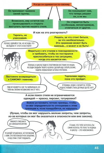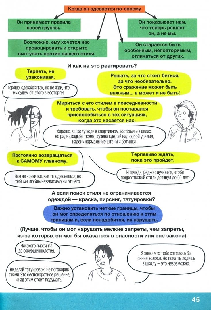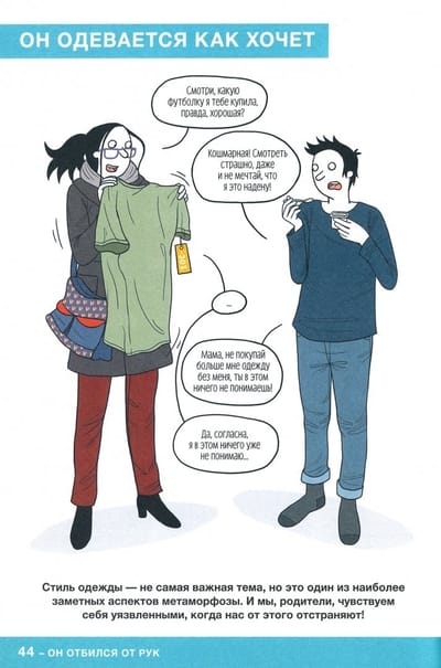 The sequel to the French bestseller from the authors of "Tips in Pictures. Let's Make a Deal. How to grow up together with your child". Well, the child grew up, and the problems of tantrums in stores - "I want ice cream right now!" - are just the flowers. Berries - here: your teenager sleeps until noon, appears later than promised with an unknown where the tattoo came from and endlessly sits in the phone. Helpful tips will help you not to miss your teen and not lose yourself in the endless figuring out of a relationship with a stranger in your home. Unlike the first book, here all situations are considered not only from the point of view of parents, but also from the point of view of teenagers. With the help of funny comics you will decipher the teenager's behavior, and the teenager will decipher yours, and together you will manage to save the relationship. Funny laconic comics by French authors will help you to see difficult situations through the eyes of a teenager and to come to an agreement both with your child and with yourself.