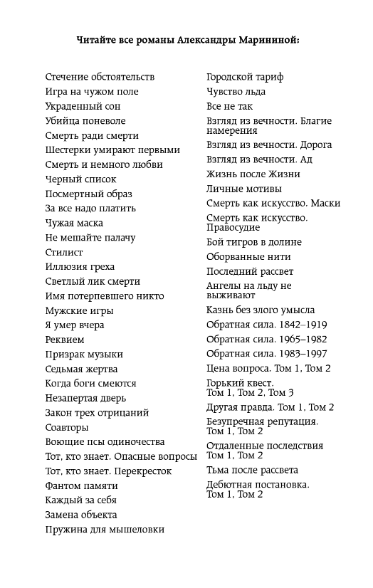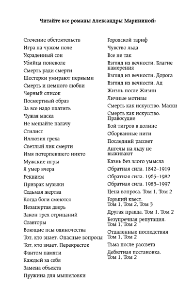 Half a century later, a young journalist, Pyotr Kravchenko, became interested in this case. The legendary Anastasia Kamenskaya, a retired operative, helps him establish contacts with people involved in those long-ago events and capable of revealing the dark secrets of the past...