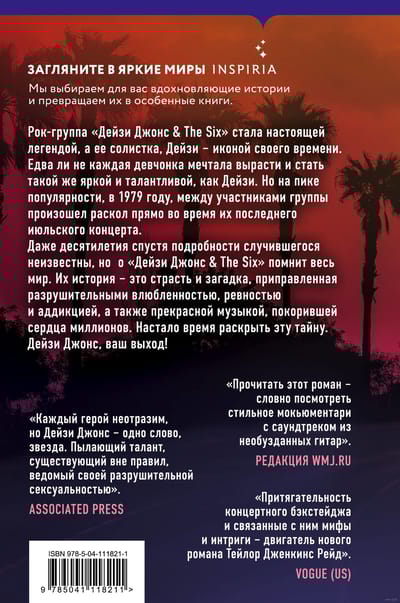 "Daisy Jones & The Six" is a legendary rock band with its own interesting fate and history, and Daisy is a true example for the generation she became thanks to her popularity and talent. But even the flame of passion of art cannot burn forever, and the band broke up - right during their last concert, remaining only in the memory of fans as a living legend of rock and roll. What caused Daisy Jones & The Six to fade so quickly? In this book, Daisy Jones will share with readers the mystery that has plagued the minds of fans for years.
