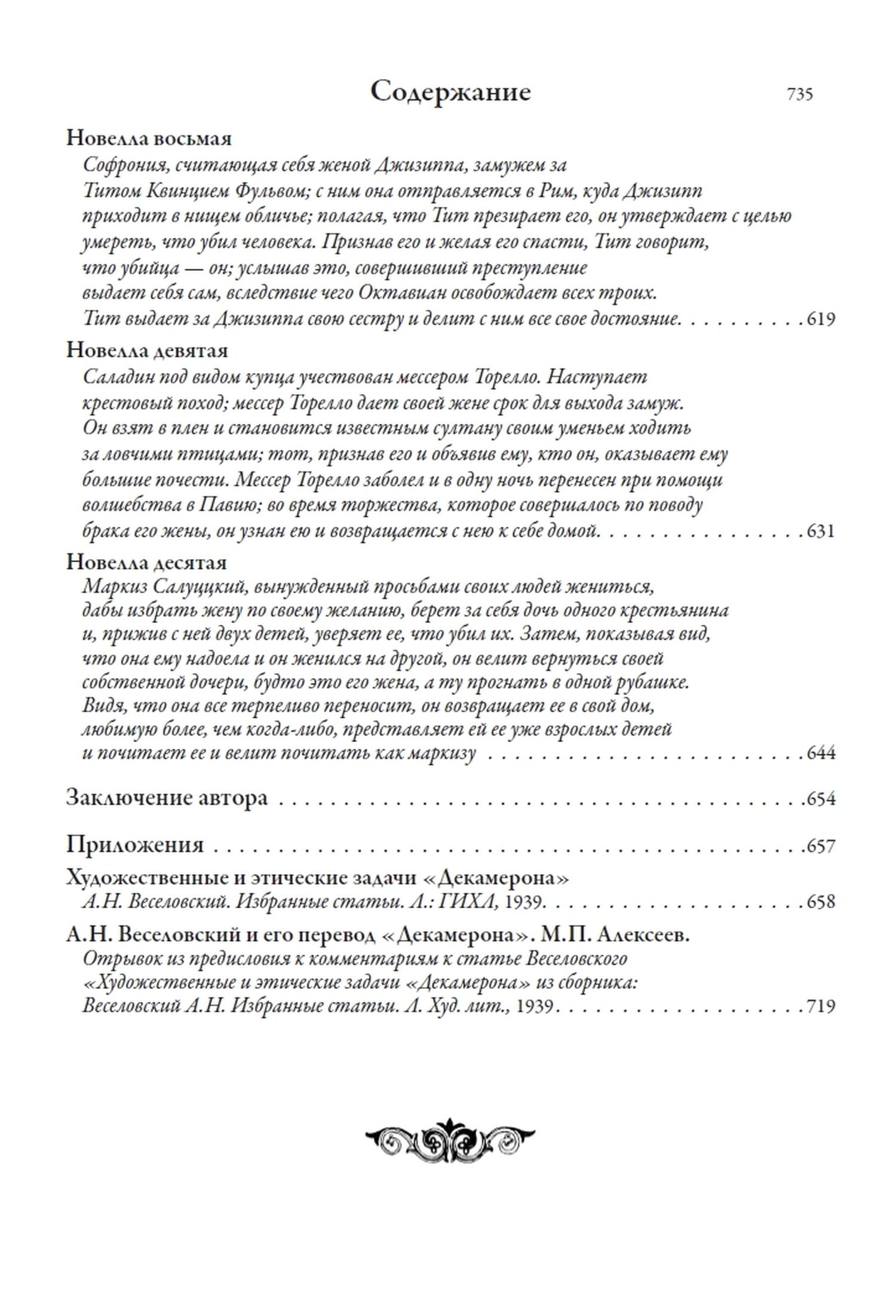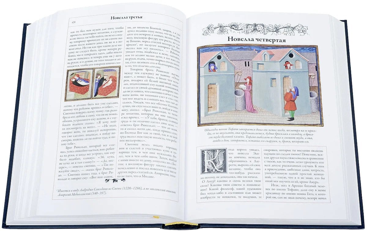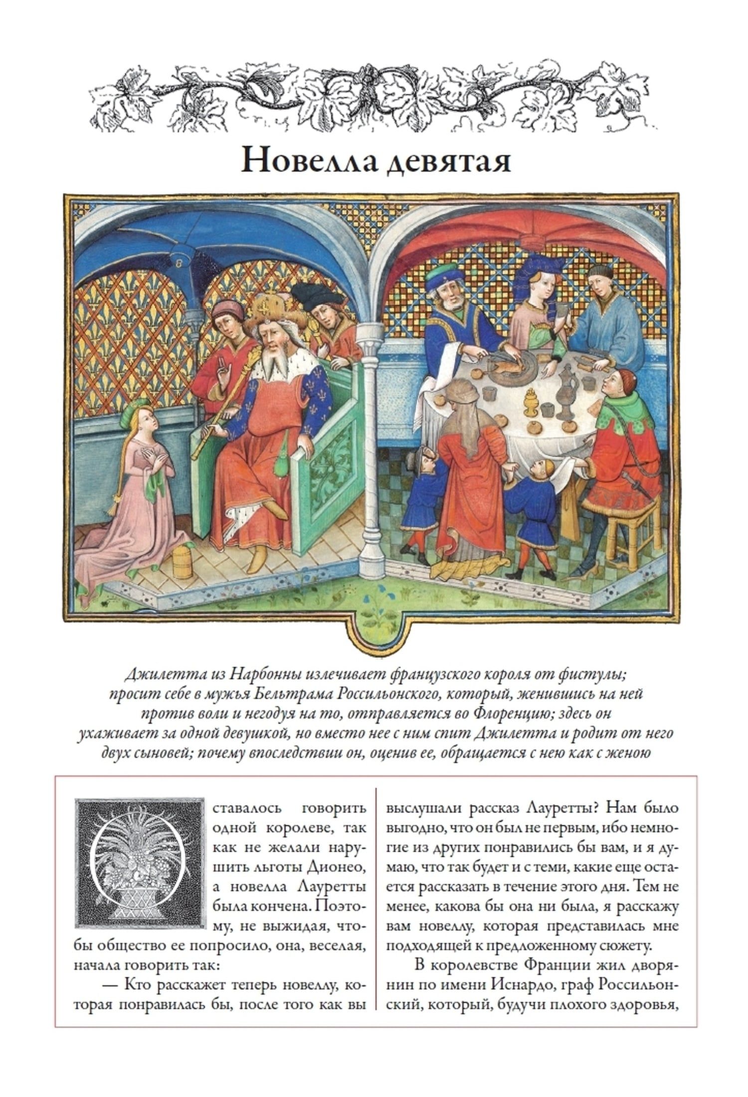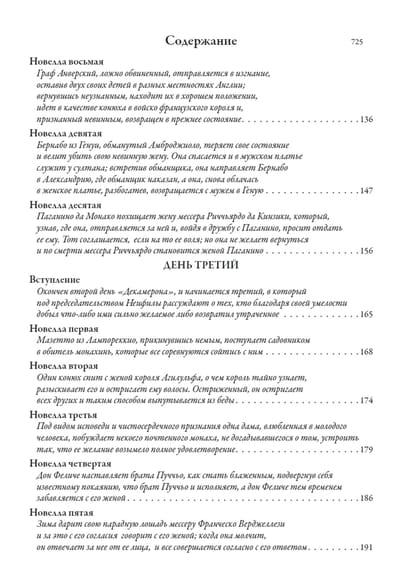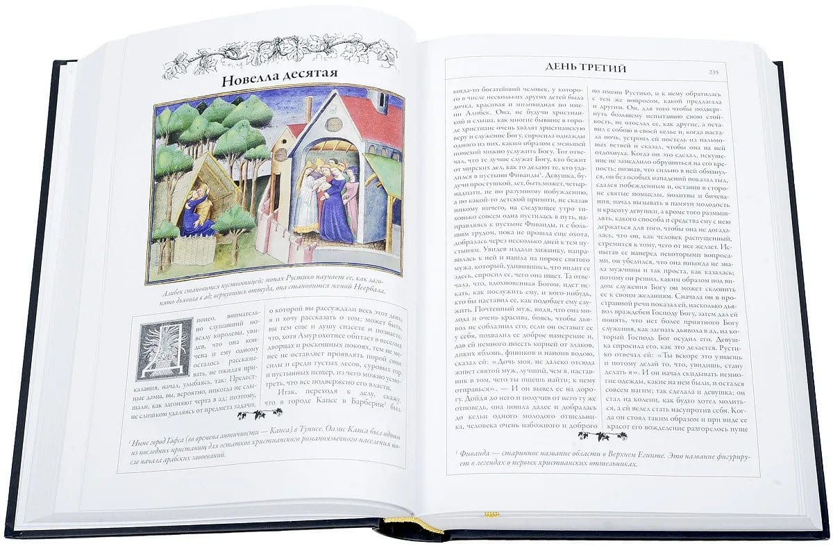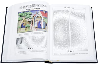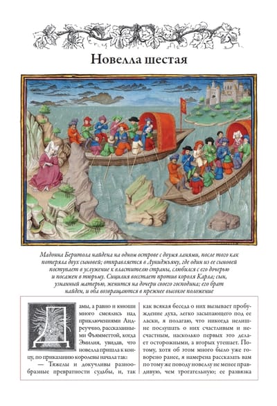 The first edition of his translation appeared in 1891–1892. The text was printed in two versions; 1,000 copies contained omissions of passages not permitted by censorship, and only 100 books were printed without cuts. It is noteworthy that the Soviet-era editions, like the Decameron publications that appeared in the 21st century, were also incomplete. This publication is free of this drawback. For the first time in more than a century of Russian publications of Boccaccio’s famous work, readers can read a complete translation of the Decameron without any abbreviations. This edition is superbly illustrated with 19th-century French engravings, as well as color miniatures from a French manuscript from the early 15th century.