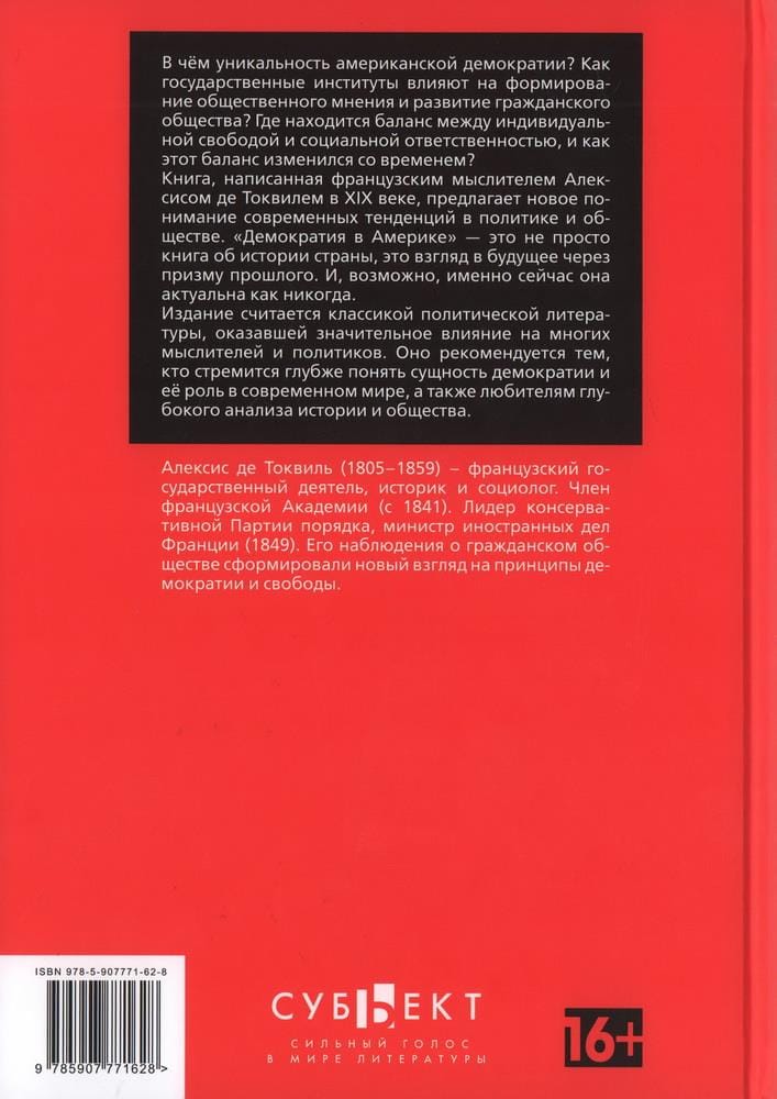What is unique about American democracy? How do state institutions influence the formation of public opinion and the development of civil society? Where is the balance between individual freedom and social responsibility, and how has this balance changed over time? Written by the nineteenth-century French thinker Alexis de Tocqueville, this book offers new insights into contemporary trends in politics and society. "Democracy in America" is not just a book about the country's history; it is a look into the future through the lens of the past. And, perhaps, it is now more relevant than ever. It is considered a classic of political literature that has had a significant influence on many thinkers and politicians. It is recommended for those who want to better understand the essence of democracy and its role in the modern world, as well as for those who like to analyze history and society in depth.