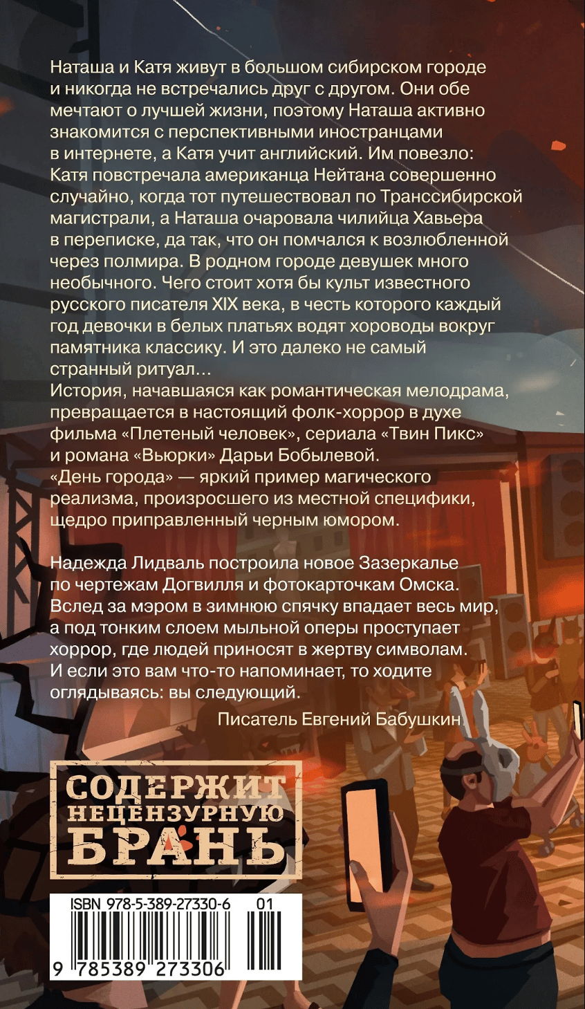 Natasha and Katya live in a large Siberian city and have never met each other. They both dream of a better life, so Natasha is actively meeting promising foreigners on the Internet, and Katya is learning English. They are lucky: Katya met an American, Nathan, completely by chance when he was traveling along the Trans-Siberian Railway, and Natasha charmed a Chilean, Javier, in correspondence, so much so that he rushed to his beloved halfway around the world. There are many unusual things in the girls' hometown. What is worth at least the cult of the famous Russian writer of the 19th century, in whose honor every year girls in white dresses dance in a circle around the monument to the classic. And this is far from the strangest ritual... The story, which began as a romantic melodrama, turns into a real folk horror in the spirit of the film "The Wicker Man" and "Finns" by Daria Bobyleva. "City Day" is a striking example of magical realism, generously seasoned with local color and black humor.