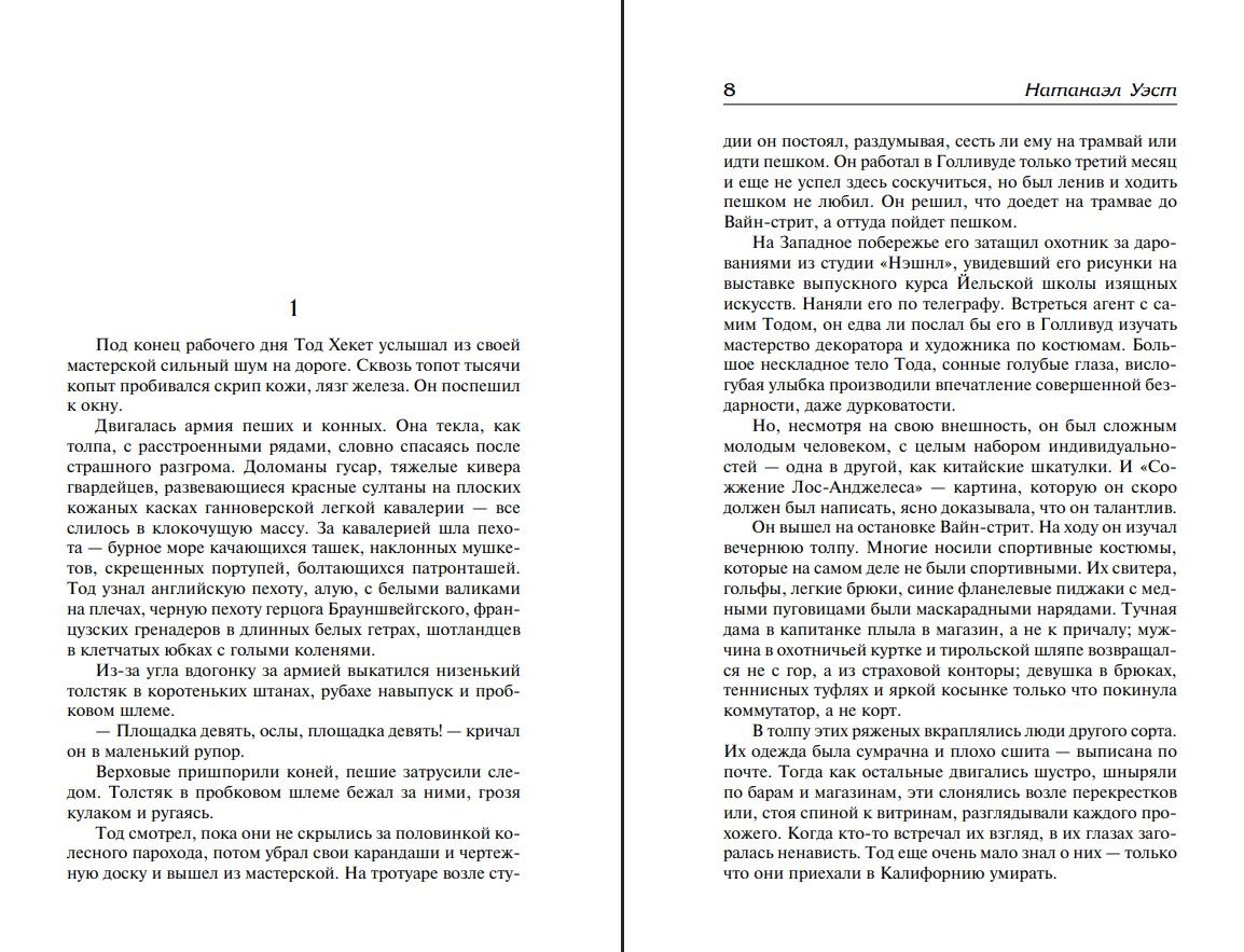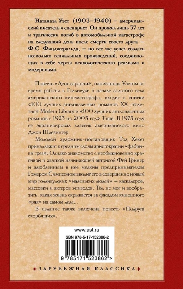 Young production designer Todd Heckett belongs to the middle class aristocracy of the "dream factory." However, his encounter with the exceptionally beautiful and tenacious aspiring actress Faye Greener and the small businessman Homer Simpson, who is in love with her, introduces him to a whole new world of Hollywood's "little people"—stuntmen, extras, and bit parts. Todd couldn't even imagine what life really was like behind the façade of the movie "paradise." The publication also includes the novella "Miss Lonelyhearts."