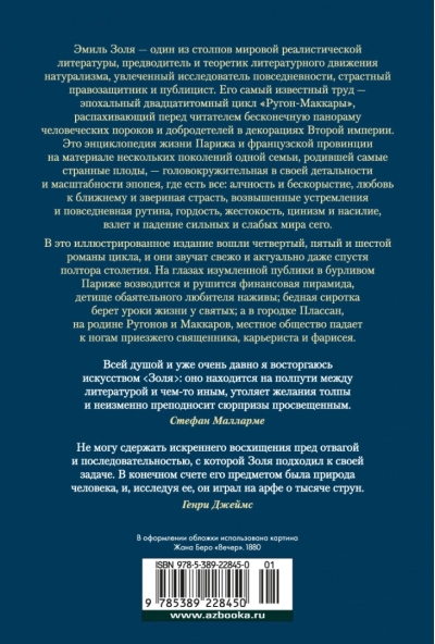 Emile Zola is one of the pillars of world realist literature, a leader and theorist of the literary movement of naturalism, a keen researcher of everyday life, a passionate human rights activist and publicist, who influenced the entire realist trend of twentieth-century literature and, above all, the school of "new journalism": Truman Capote, Tom Wolfe, Norman Mailer. His most famous work is the epochal twenty-volume cycle "Rugon-Macquaries", opening before the reader an endless panorama of human vices and virtues in the scenery of the Second Empire. This is an encyclopedia of life in Paris and the French province on the material of several generations of one family, which gave birth to the most bizarre fruits - dizzying in its detail and scale epic, where there is everything: greed and selflessness, love of neighbor and animal passion, lofty aspirations and daily routine, pride, cruelty, cynicism and violence, the rise and fall of the strong and weak of this world. This illustrated edition includes the fourth, fifth and sixth novels of the cycle, and they sound fresh and relevant even after a century and a half. Before the eyes of the amazed public in the turbulent Paris erected and collapses financial pyramid, the brainchild of a charming lover of profit, a poor orphan girl takes life lessons from the saints, and in the backwater town of Plassan, the birthplace of Rugonov and Makkarov, the local society falls at the feet of a visiting priest, careerist and Pharisee. The novels The Dream and The Conquest of Plassan are published in new translations. Some of Nathan Altman's illustrations for the novel Money are published for the first time.
