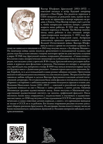 This collection includes sixty-six stories from the cycle of the Soviet children's writer Viktor Yuzefovich Dragunsky "Deniskiny rasskazy", as well as two plays and two stories adjacent to this cycle.