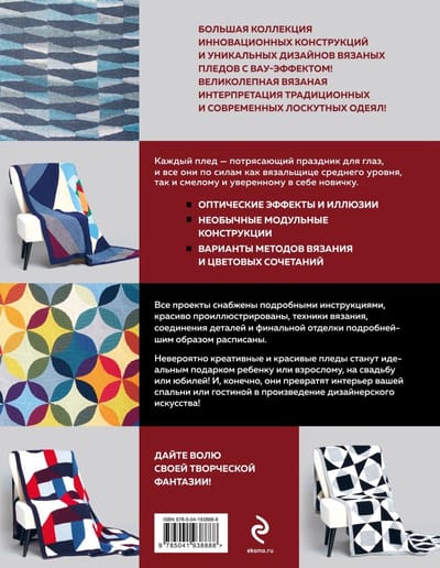 Every plaid you knit with this book is a stunning feast for the eyes, and all of them can be made by both the intermediate knitter and the bold, confident beginner. Whether you knit them in the same way as the author suggests, or match the yarn colors to your interior design, the result will be stunning! - Optical effects and illusions. - Unusual modular designs. - Variants of knitting methods and color combinations. All projects are provided with detailed instructions, beautifully illustrated, knitting techniques, joining parts and final finishing are described in detail. Some plaids can be knitted in different ways, in this case instructions are given for all the variations and you can choose the knitting method you like. Yarns suitable for such luxurious plaids are affordable and easy to find in stores. Incredibly creative and beautiful plaids will be the perfect gift for a child or adult for a wedding or anniversary! And, of course, they will turn the interior of your bedroom or living room into a work of design art! Give free rein to your creative imagination!