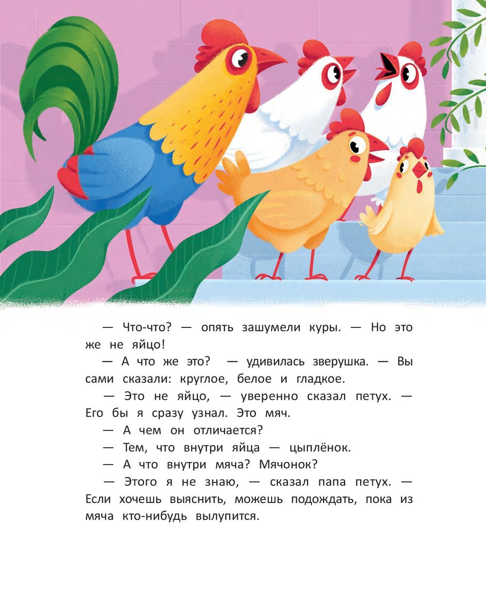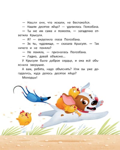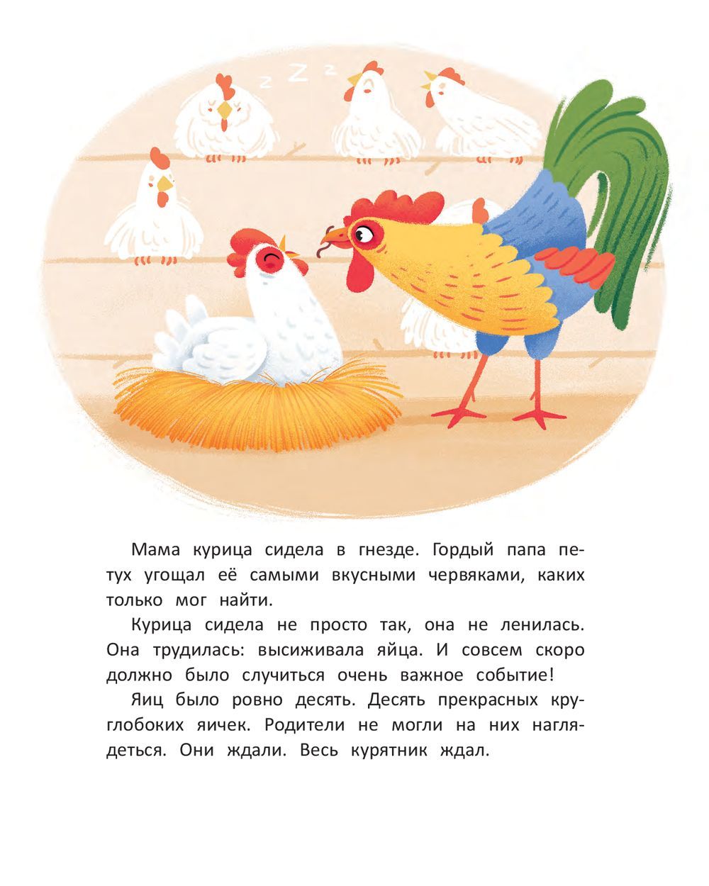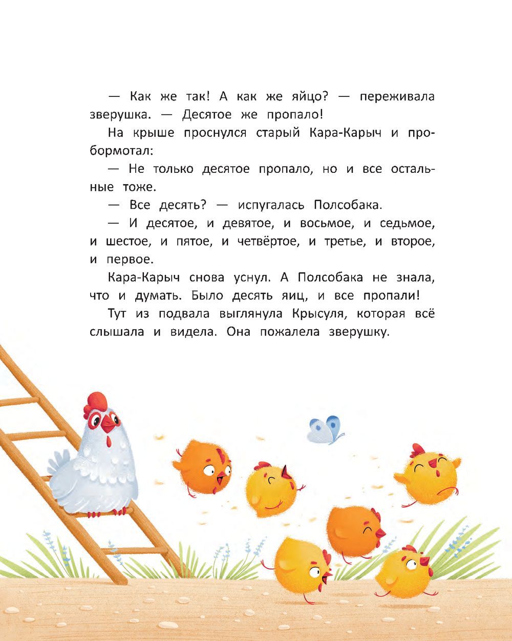 One morning, the mama hen discovers a loss: the tenth egg has disappeared! Papa Rooster sets out to investigate the theft in the company of five older hens, four young ones, three older chickens, two middle chickens and one very small one. Where will their search lead them?