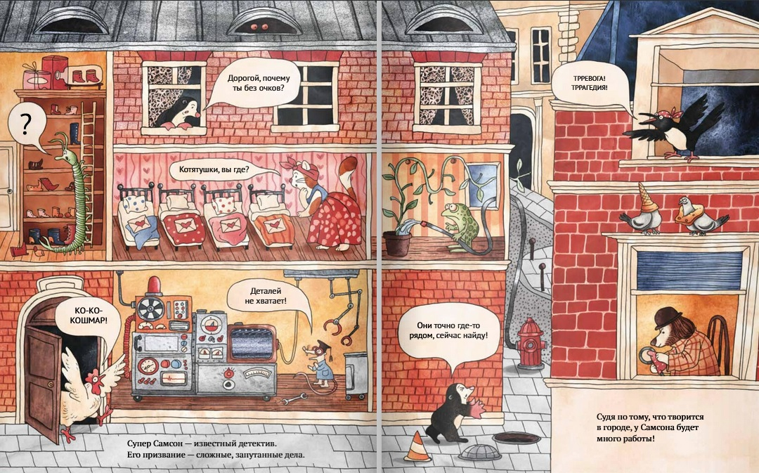 Something strange is happening in the city, which means detective Samson has a busy day ahead: complex cases and intricate mysteries are his calling. No wonder he is the most popular detective in the area! In search of clues, he will have to visit noisy streets and a flooded cave, under the scorching sun on the beach and at the snow-capped mountain peaks - while others are relaxing, Samson is acting! "Detective Samson" is a witty, funny and exciting wimmelbuch, which was created and drawn by Katerina Gorelik. A real detective game for the whole family!