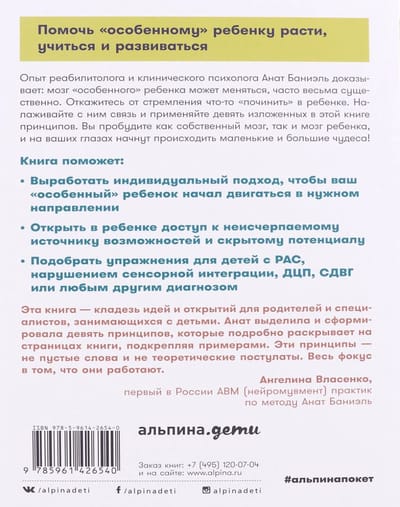 Brain disorders, which are often associated with diseases such as cerebral palsy, autism and various genetic diseases, can be corrected. Anat Baniel, clinical psychologist and author of the unique method of rehabilitation for special children "ABM", is sure that there are no incurable children, the main thing is an individual approach and regularity. Having understood the basic principles of brain plasticity and rehabilitation techniques taught by Anat Baniel, parents will be able to work with doctors, physiotherapists, as well as working with the child on their own, to help him/her build a new brain structure, and as a result, improve the quality of life and adapt to society in spite of hopeless diagnoses. According to Anat Baniel, there are no incurable children, the main thing is an individualized approach, regular training and understanding of the enormous potential of the plastic human brain. Based on the nine principles that underlie the ABM method, you will be able to understand for yourself what is useful for your child on the road to recovery, and will help you choose: rehabilitation specialists; the necessary procedures and the right time for their implementation; the most effective exercises for your child. By giving up the urge to "fix" something in your child, instead connecting with them and applying the nine principles outlined in this book, you will awaken both your own brain and your child's brain, and small and large miracles will begin to happen before your eyes. Observe the author's real-life lessons with a wide variety of young patients. Get practical tips for interacting and practicing with your child at home. Learn about the latest developments from the world's leading neuroscientists. Of interest to parents who want to help their child adapt to society despite hopeless diagnoses.