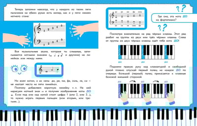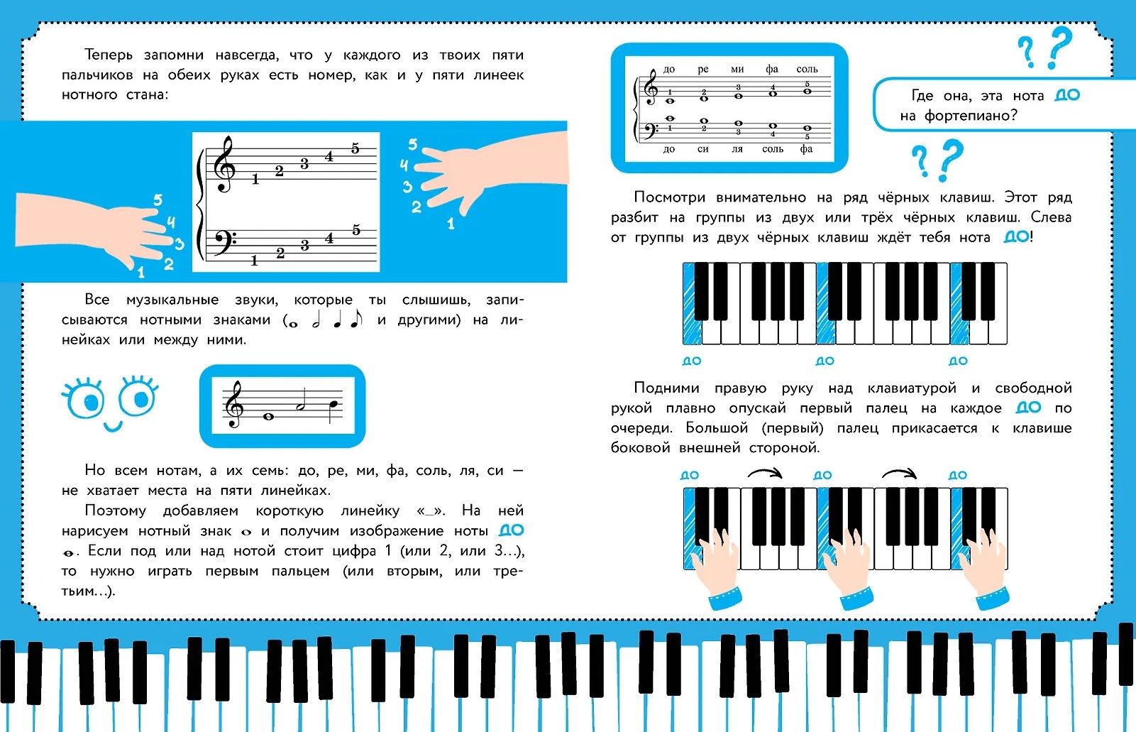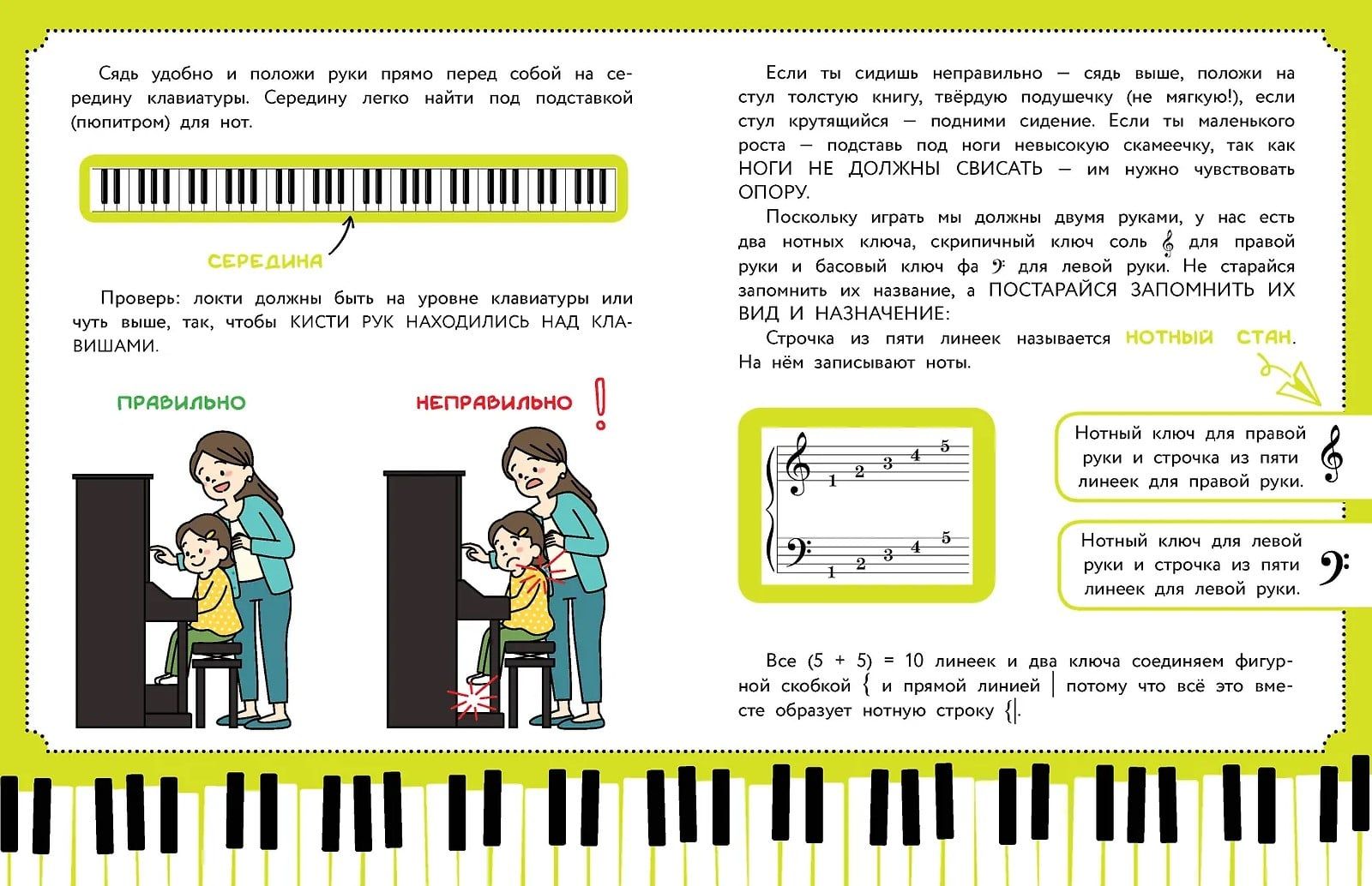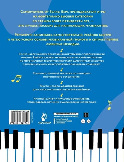 - A bright set of piano key stickers with labeled notes. Your child can apply them to their instrument as they progress through the theoretical portion of the guide, helping them quickly memorize notes and finger placement on the keys.